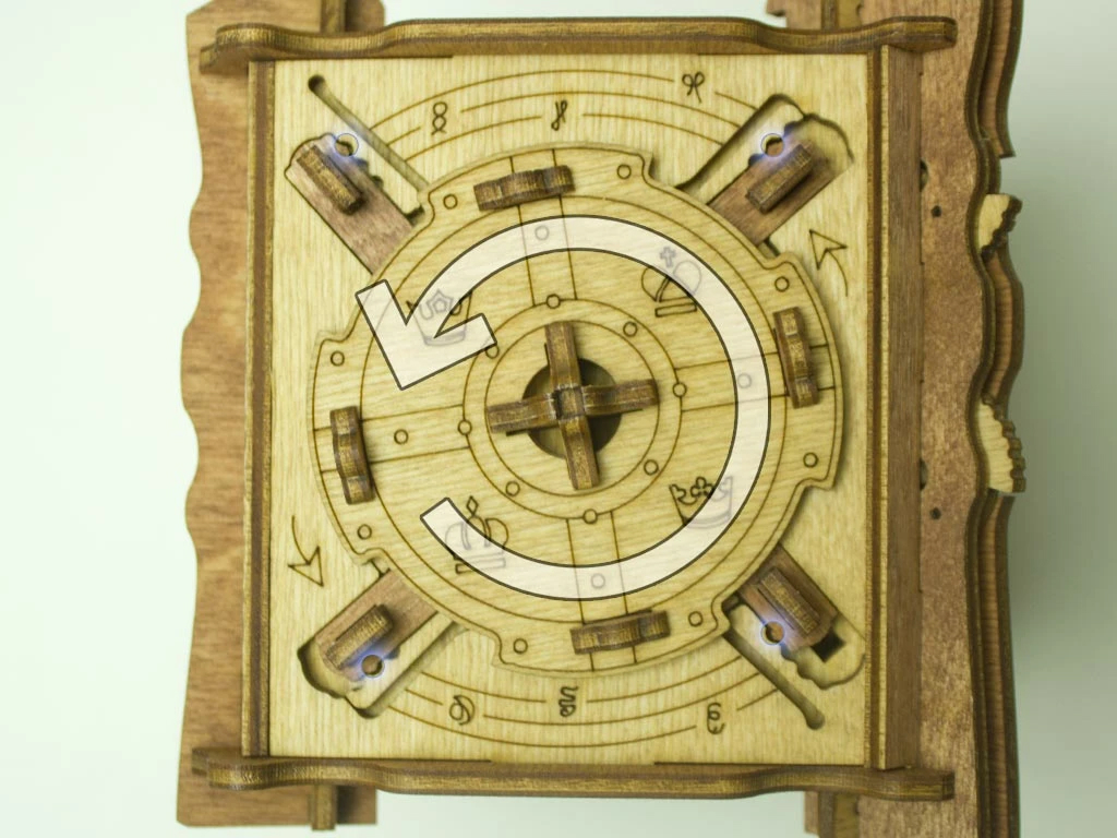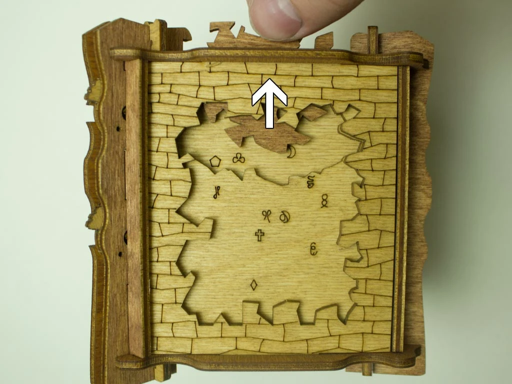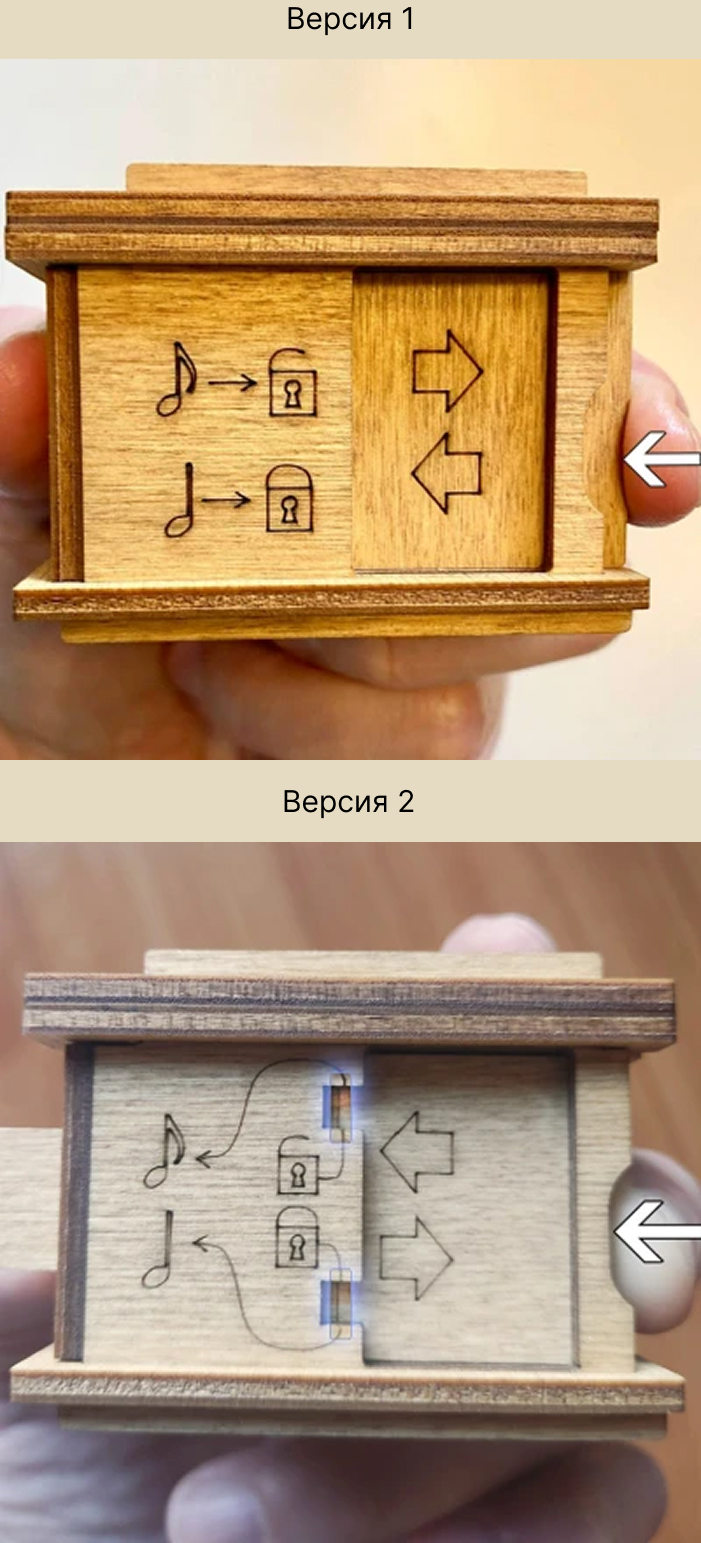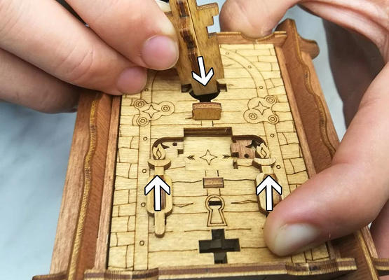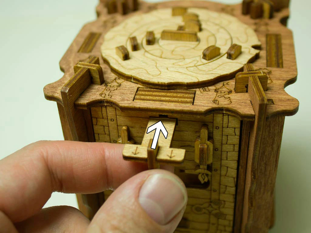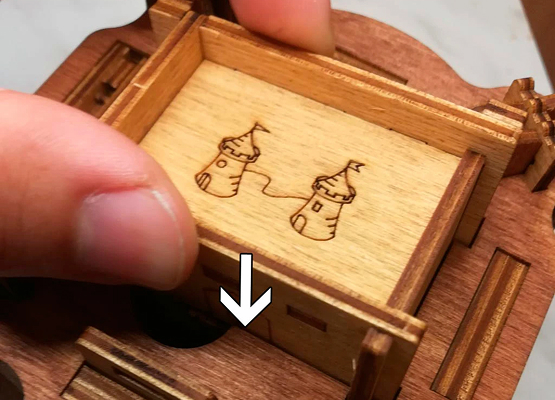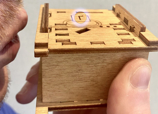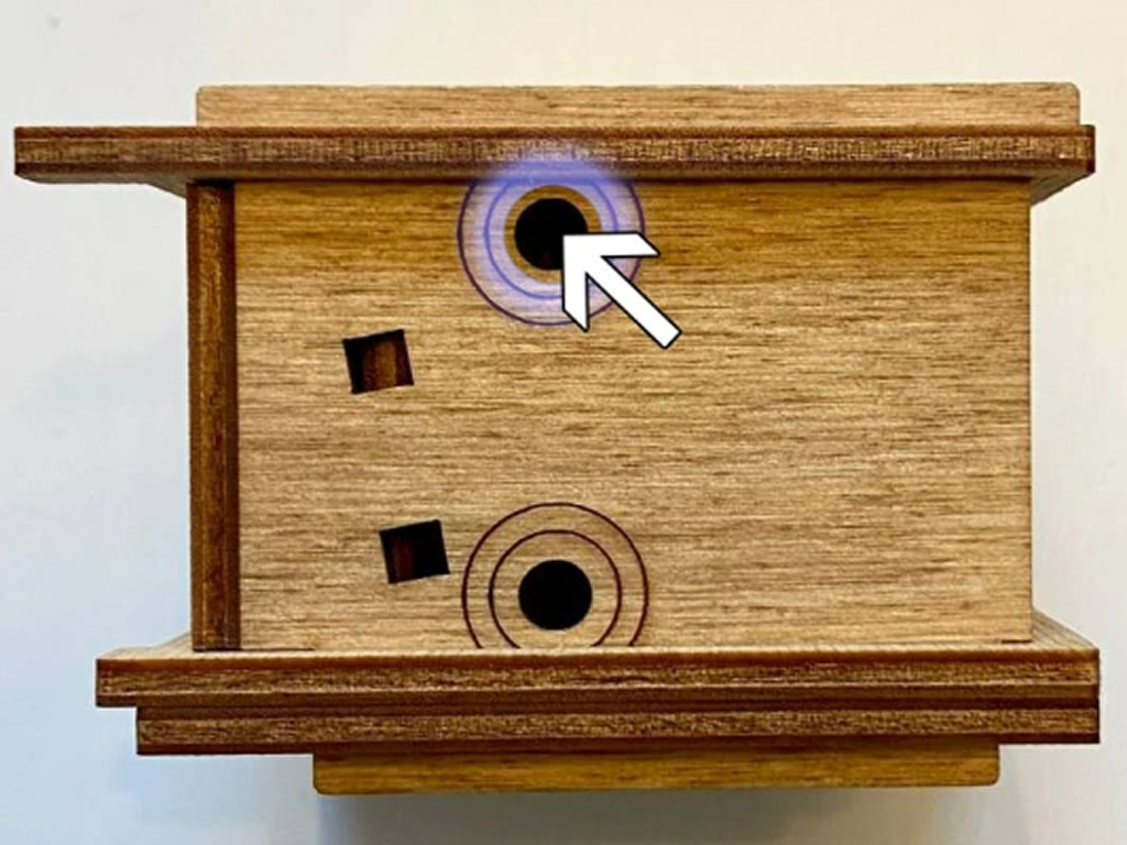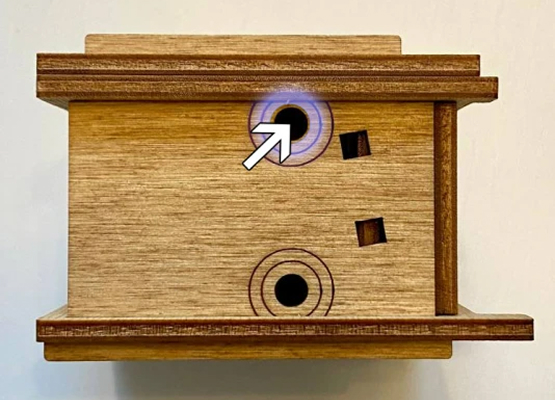 Здесь есть два отверстия, в одно из них нужно дуть, чтобы разблокировать дверцу (другое запирает его). Держите коробку горизонтально перед ртом, как будто это труба. Резко подуйте в верхнее отверстие, показанное на фото. Не нужно касаться его губами, достаточно небольшого расстояния. Во время вдувания придерживайте дверцу с обратной стороны закрытой.