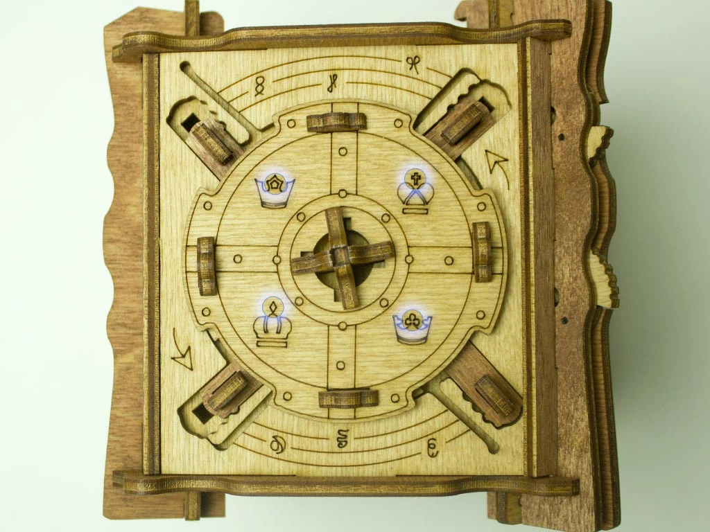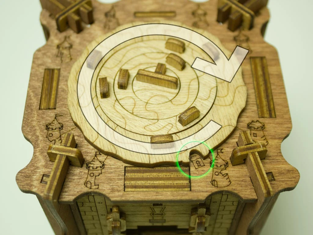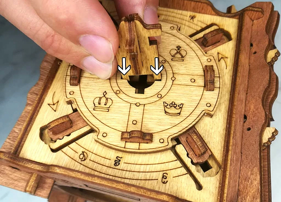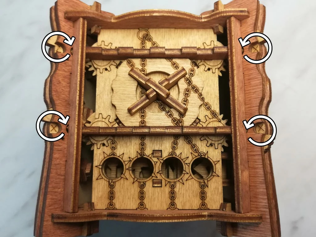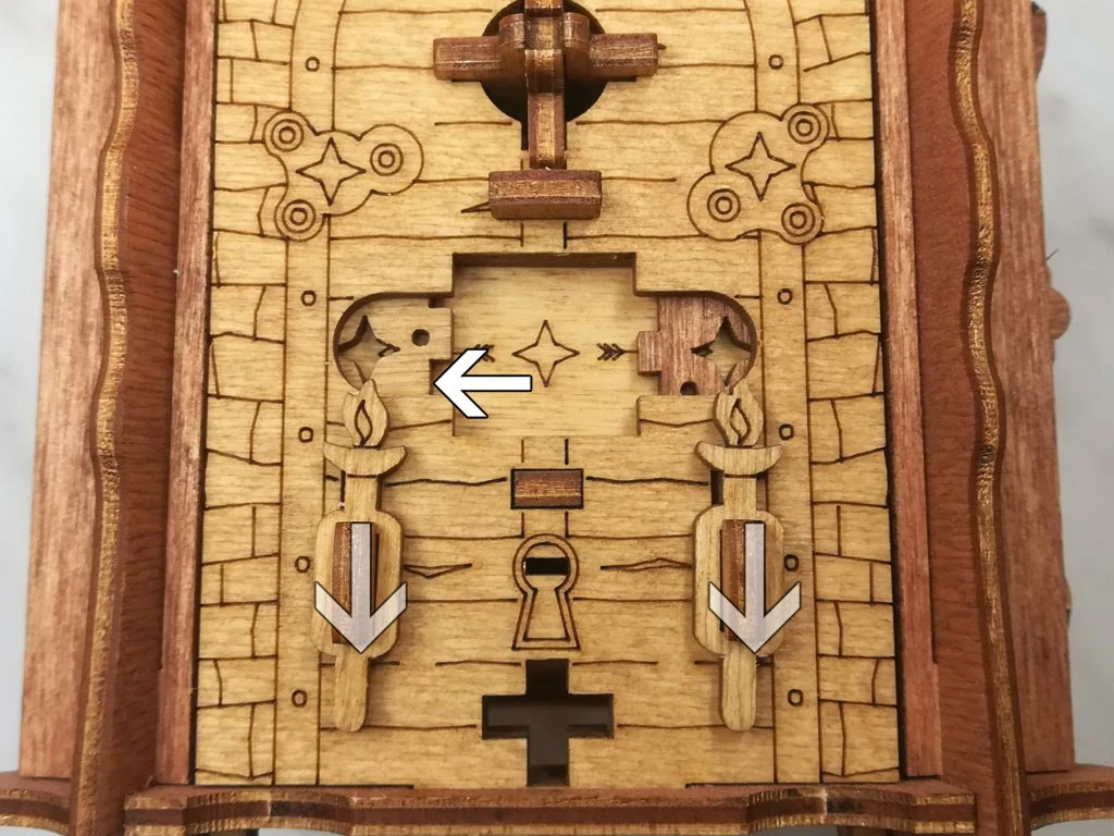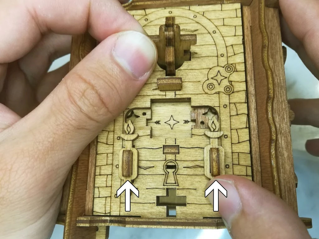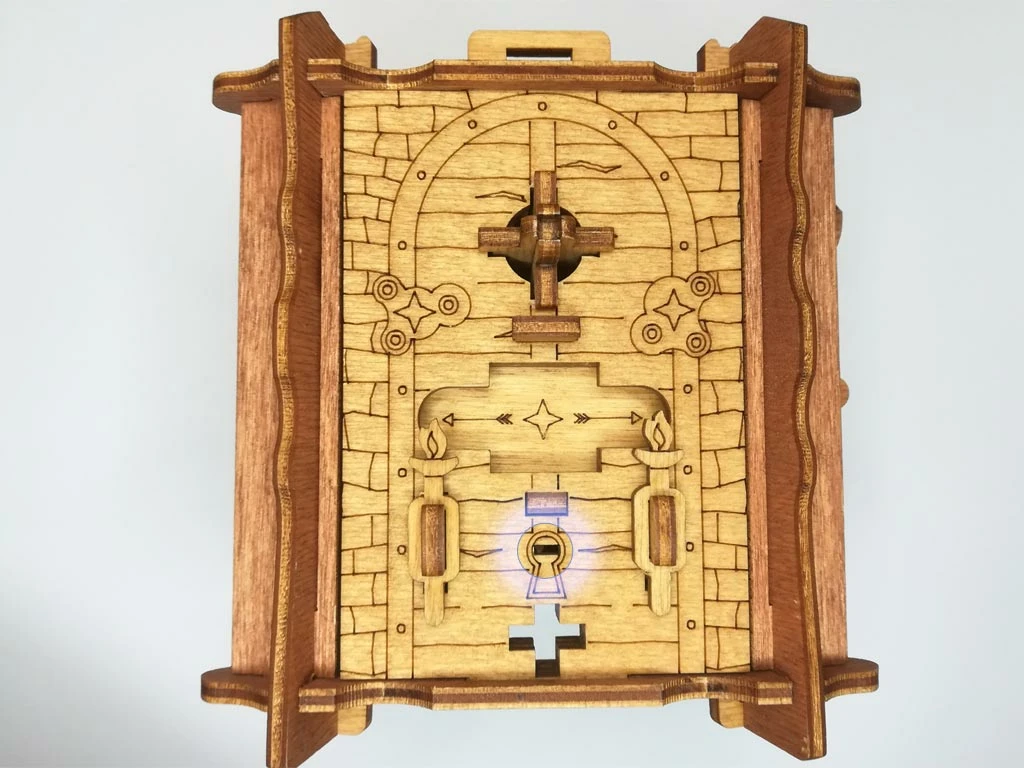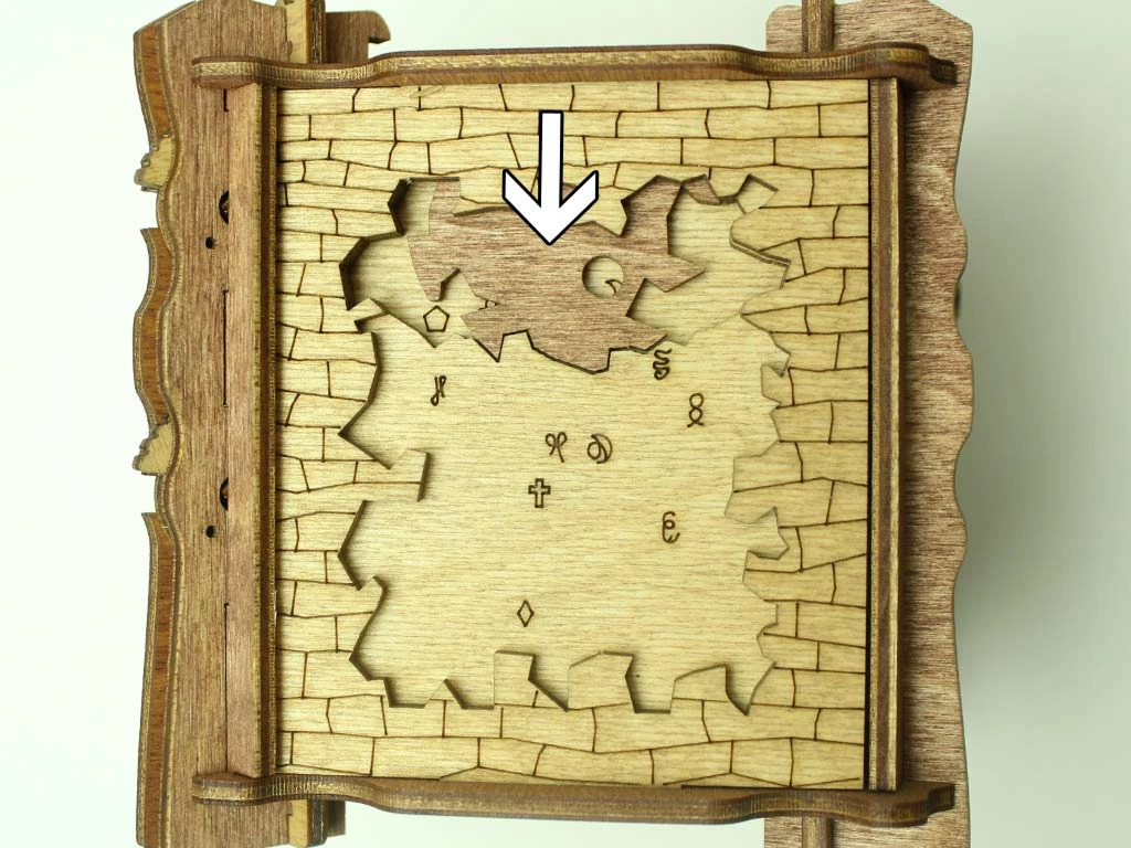 Здесь есть два отверстия, в одно из них нужно дуть, чтобы разблокировать дверцу (другое запирает его). Держите коробку горизонтально перед ртом, как будто это труба. Резко подуйте в верхнее отверстие, показанное на фото. Не нужно касаться его губами, достаточно небольшого расстояния. Во время вдувания придерживайте дверцу с обратной стороны закрытой.