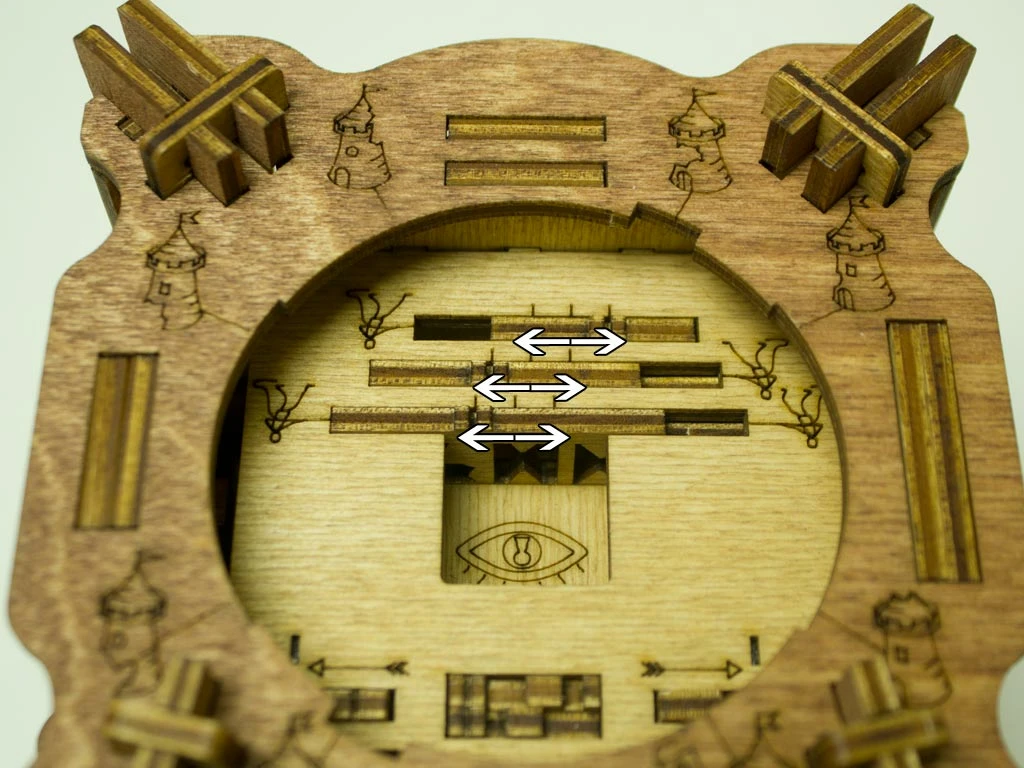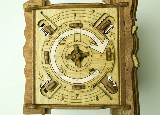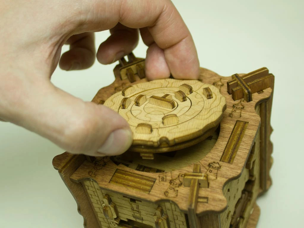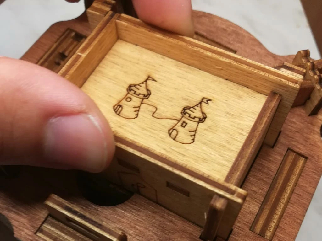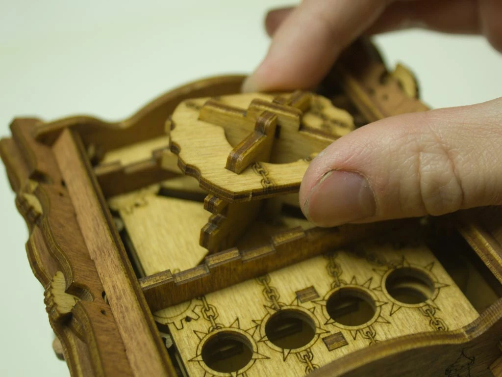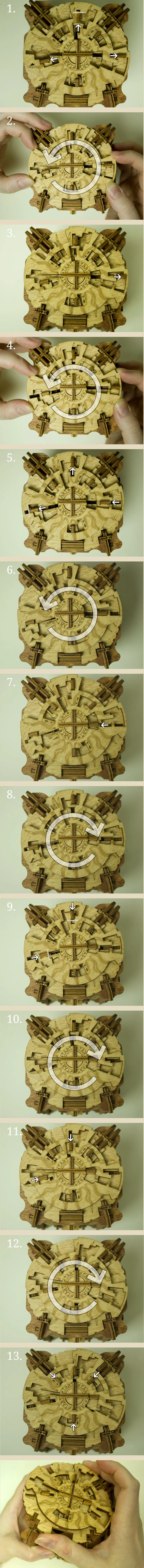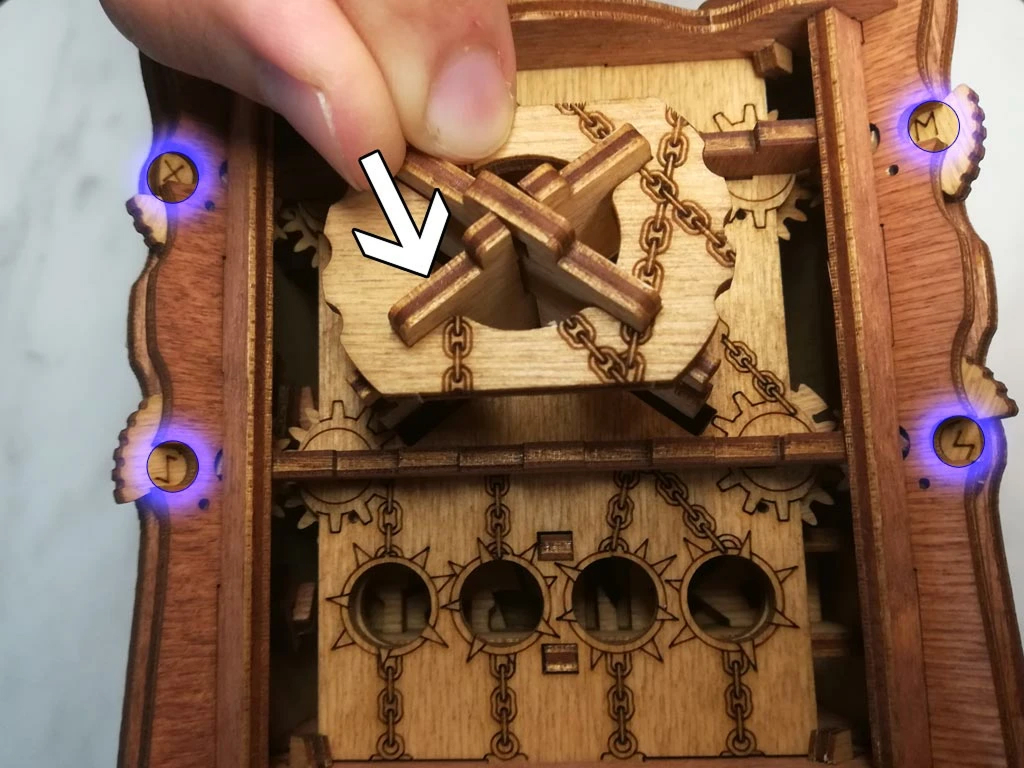 Здесь есть два отверстия, в одно из них нужно дуть, чтобы разблокировать дверцу (другое запирает его). Держите коробку горизонтально перед ртом, как будто это труба. Резко подуйте в верхнее отверстие, показанное на фото. Не нужно касаться его губами, достаточно небольшого расстояния. Во время вдувания придерживайте дверцу с обратной стороны закрытой.
