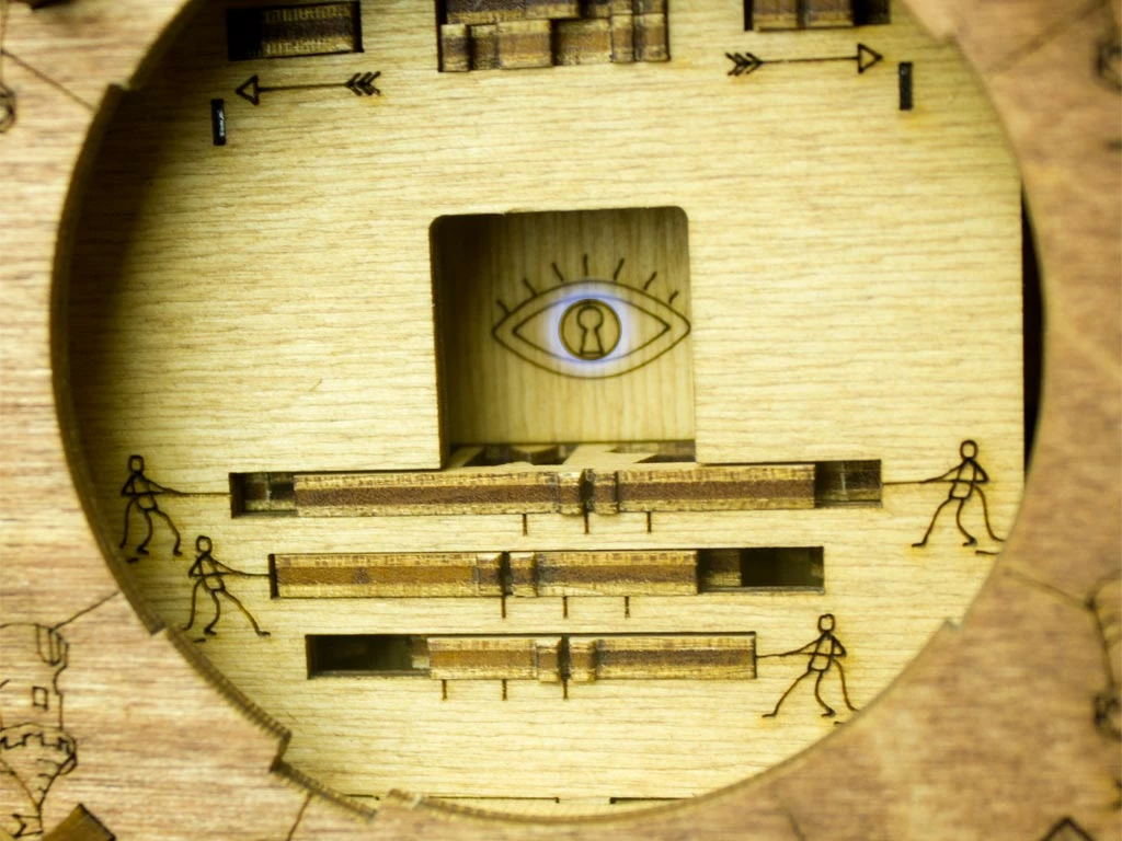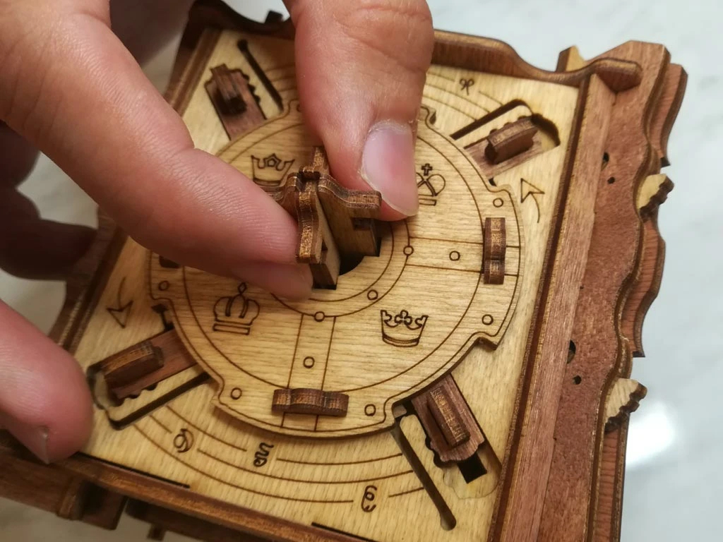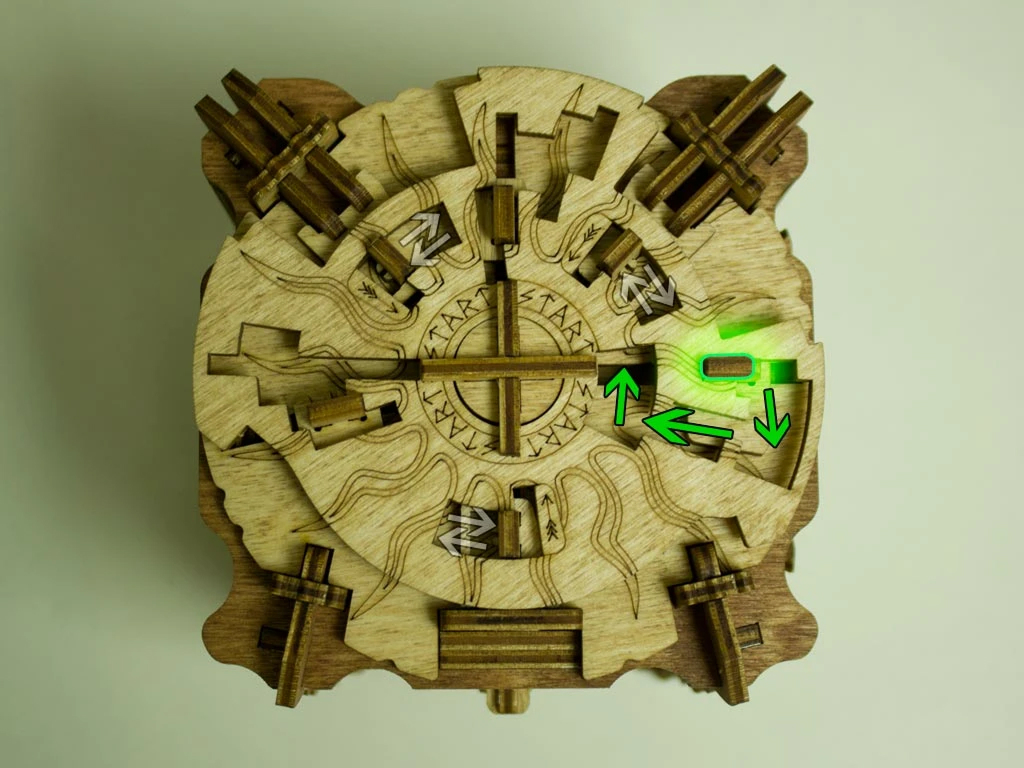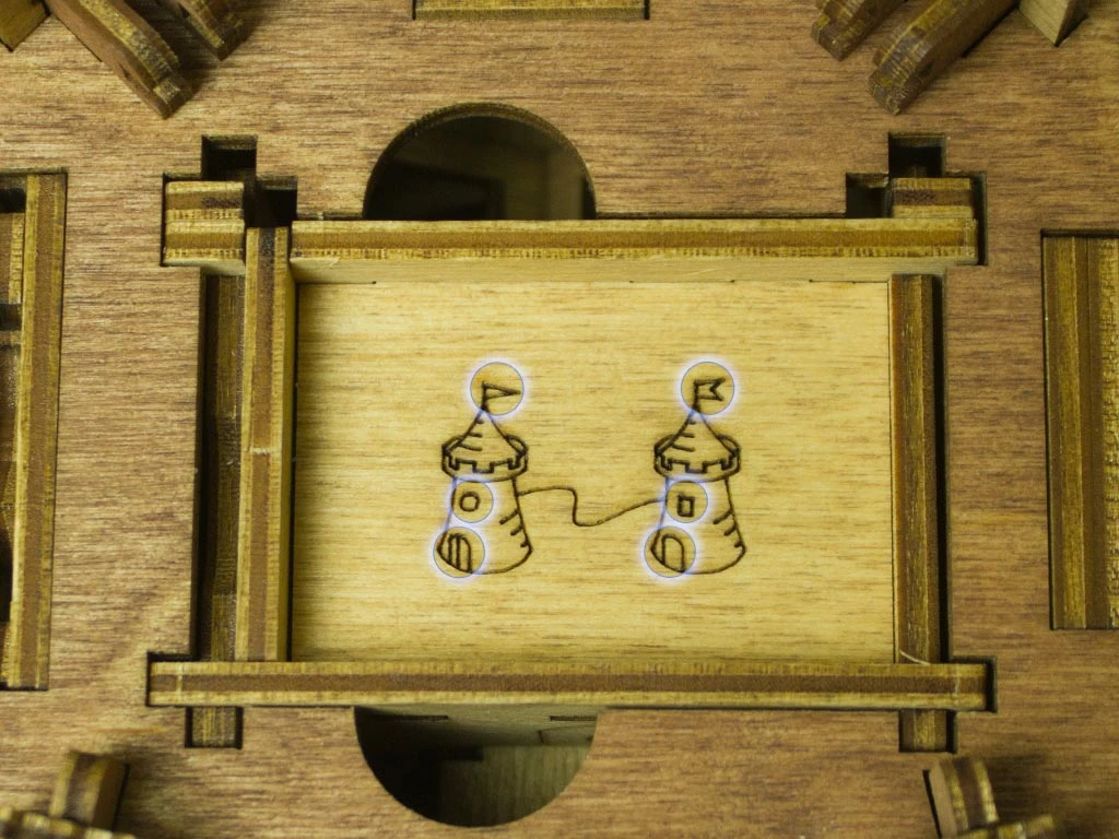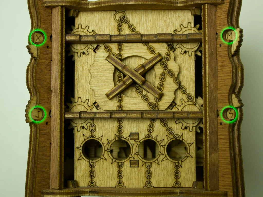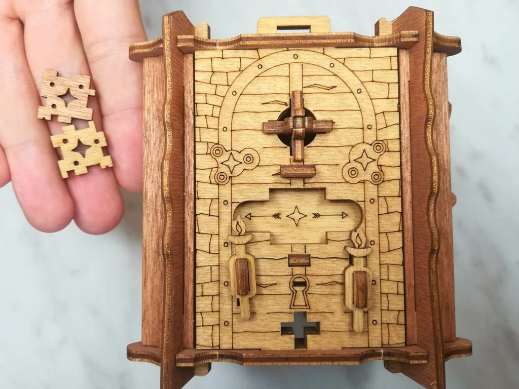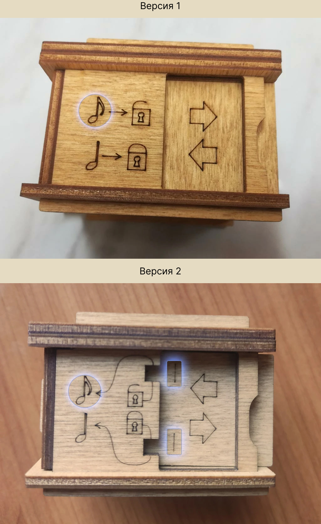 Здесь есть два отверстия, в одно из них нужно дуть, чтобы разблокировать дверцу (другое запирает его). Держите коробку горизонтально перед ртом, как будто это труба. Резко подуйте в верхнее отверстие, показанное на фото. Не нужно касаться его губами, достаточно небольшого расстояния. Во время вдувания придерживайте дверцу с обратной стороны закрытой.
