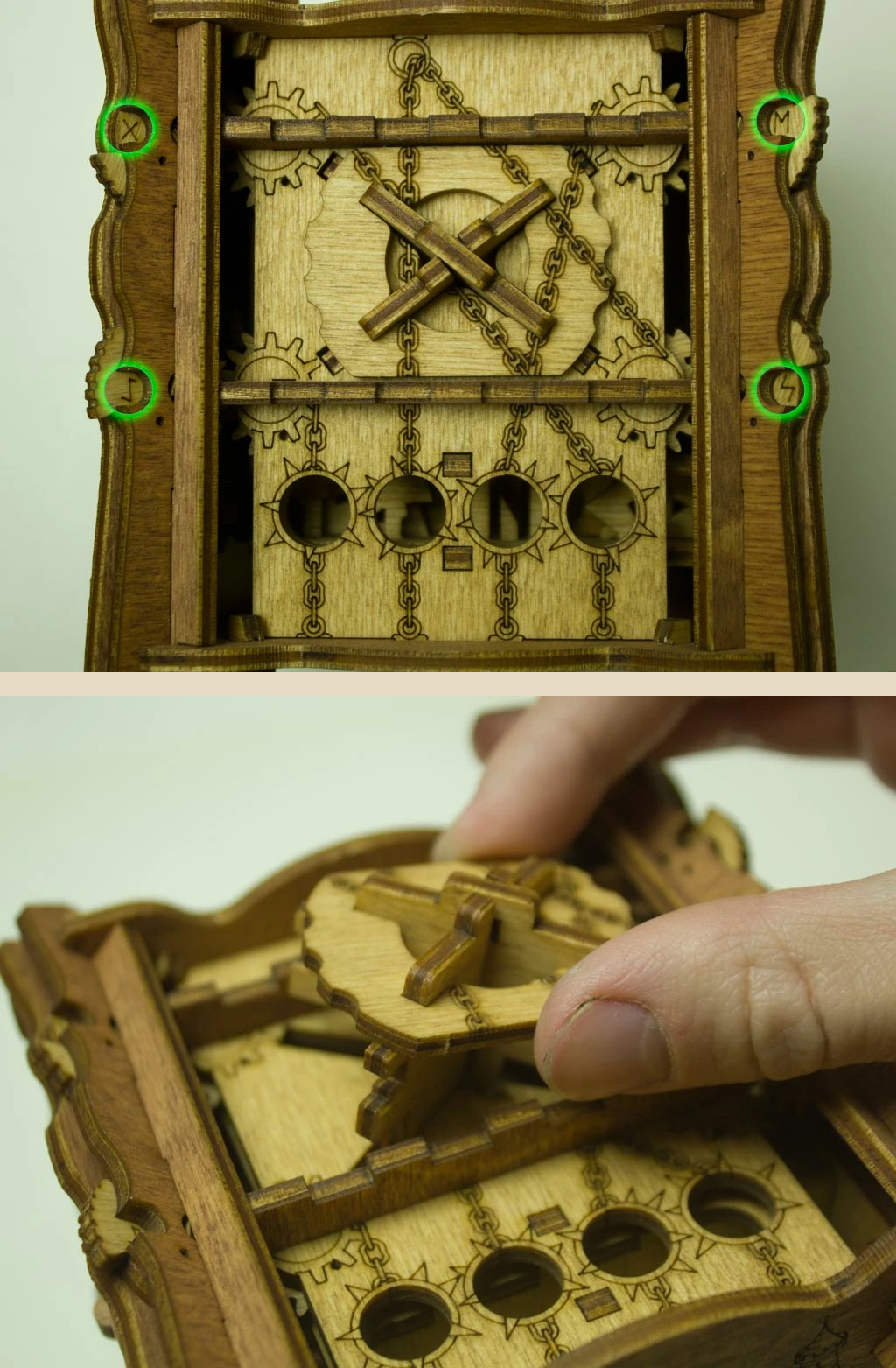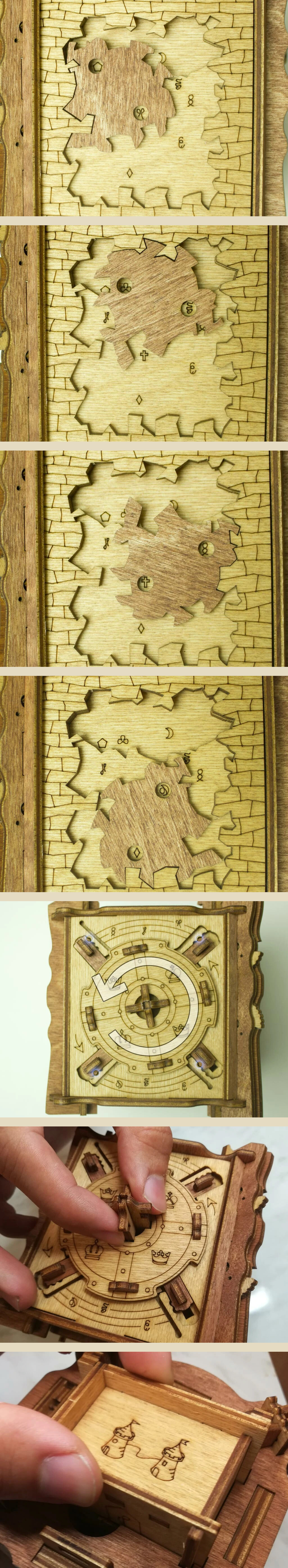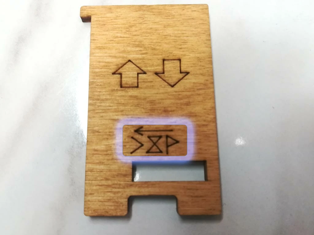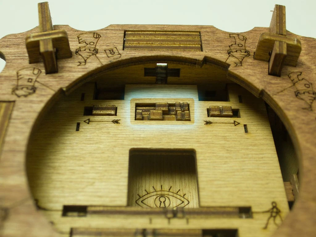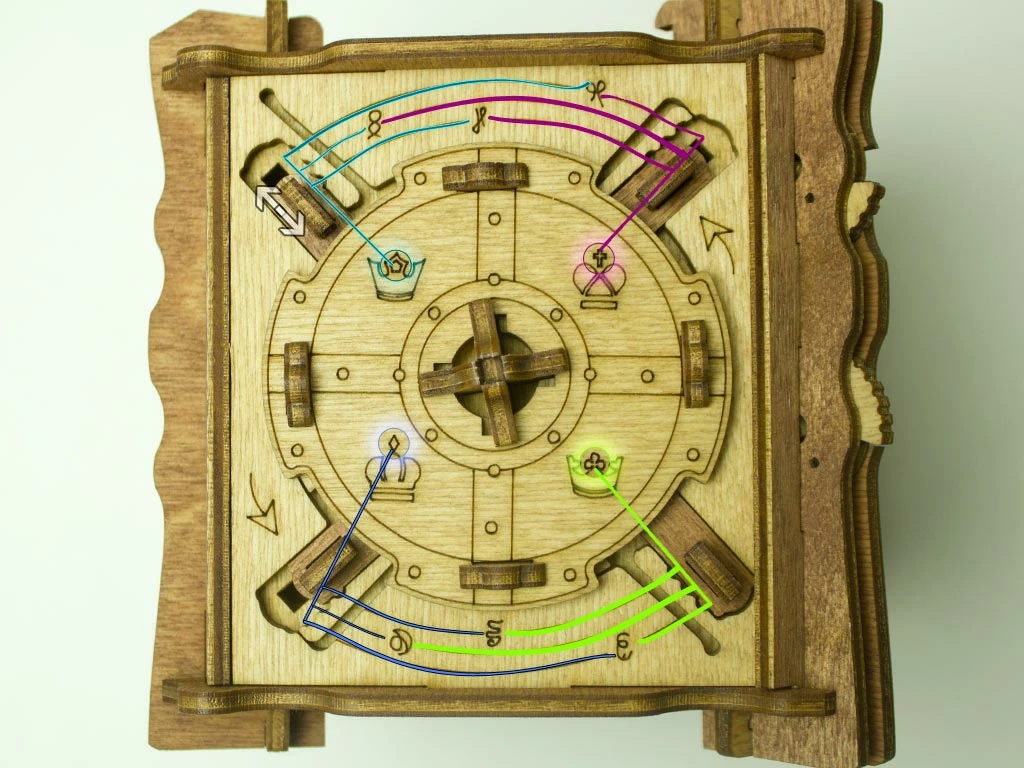 Здесь есть два отверстия, в одно из них нужно дуть, чтобы разблокировать дверцу (другое запирает его). Держите коробку горизонтально перед ртом, как будто это труба. Резко подуйте в верхнее отверстие, показанное на фото. Не нужно касаться его губами, достаточно небольшого расстояния. Во время вдувания придерживайте дверцу с обратной стороны закрытой.