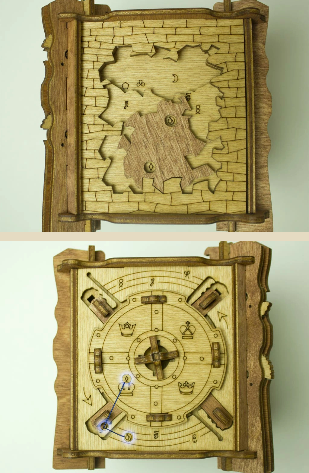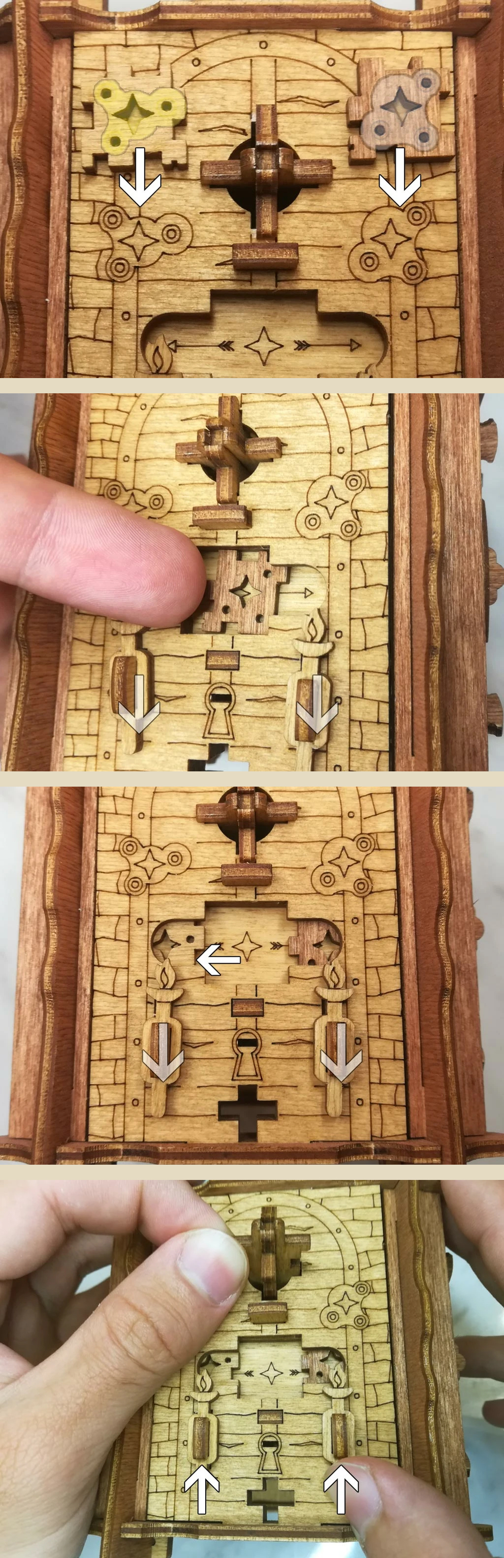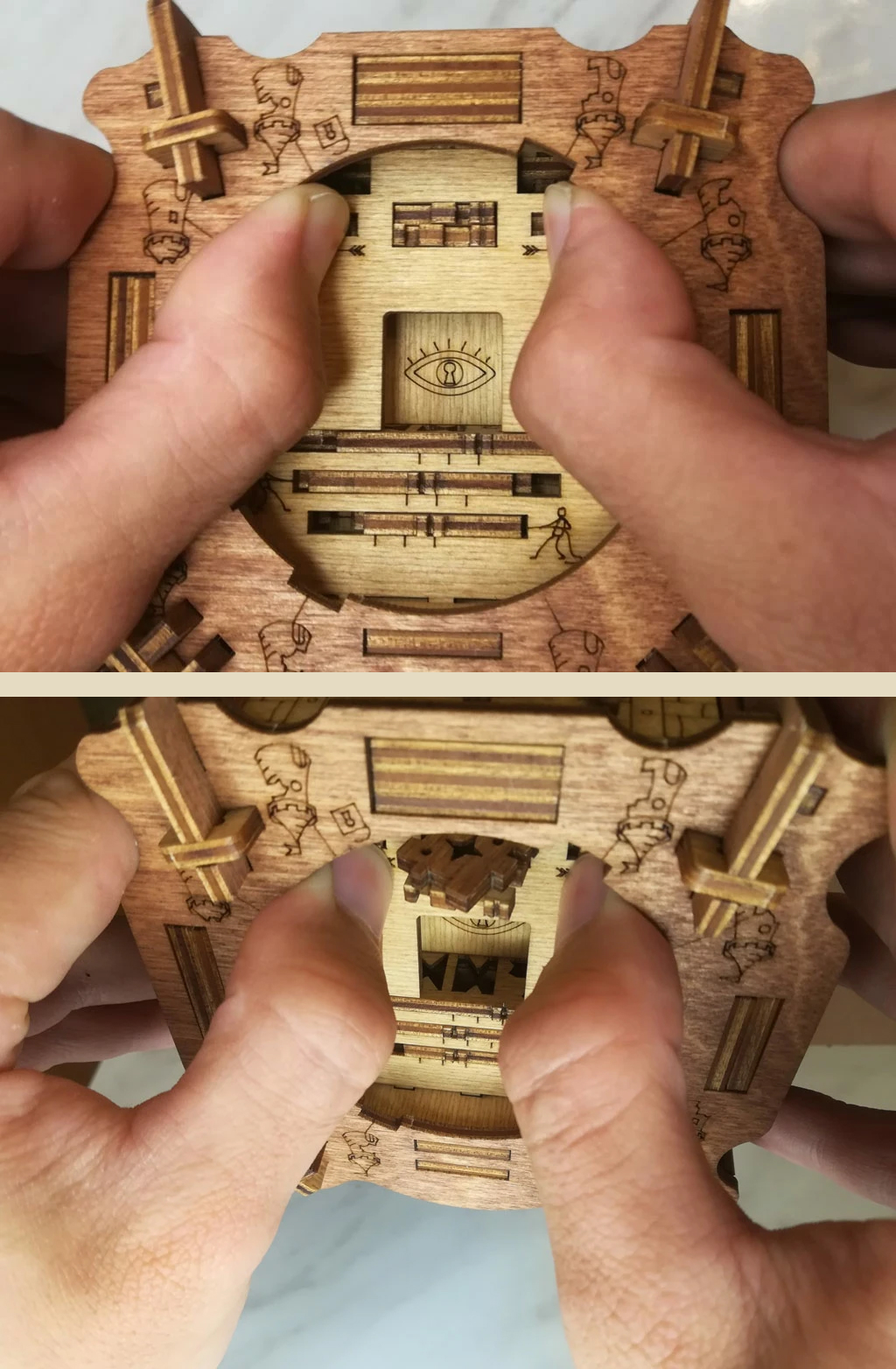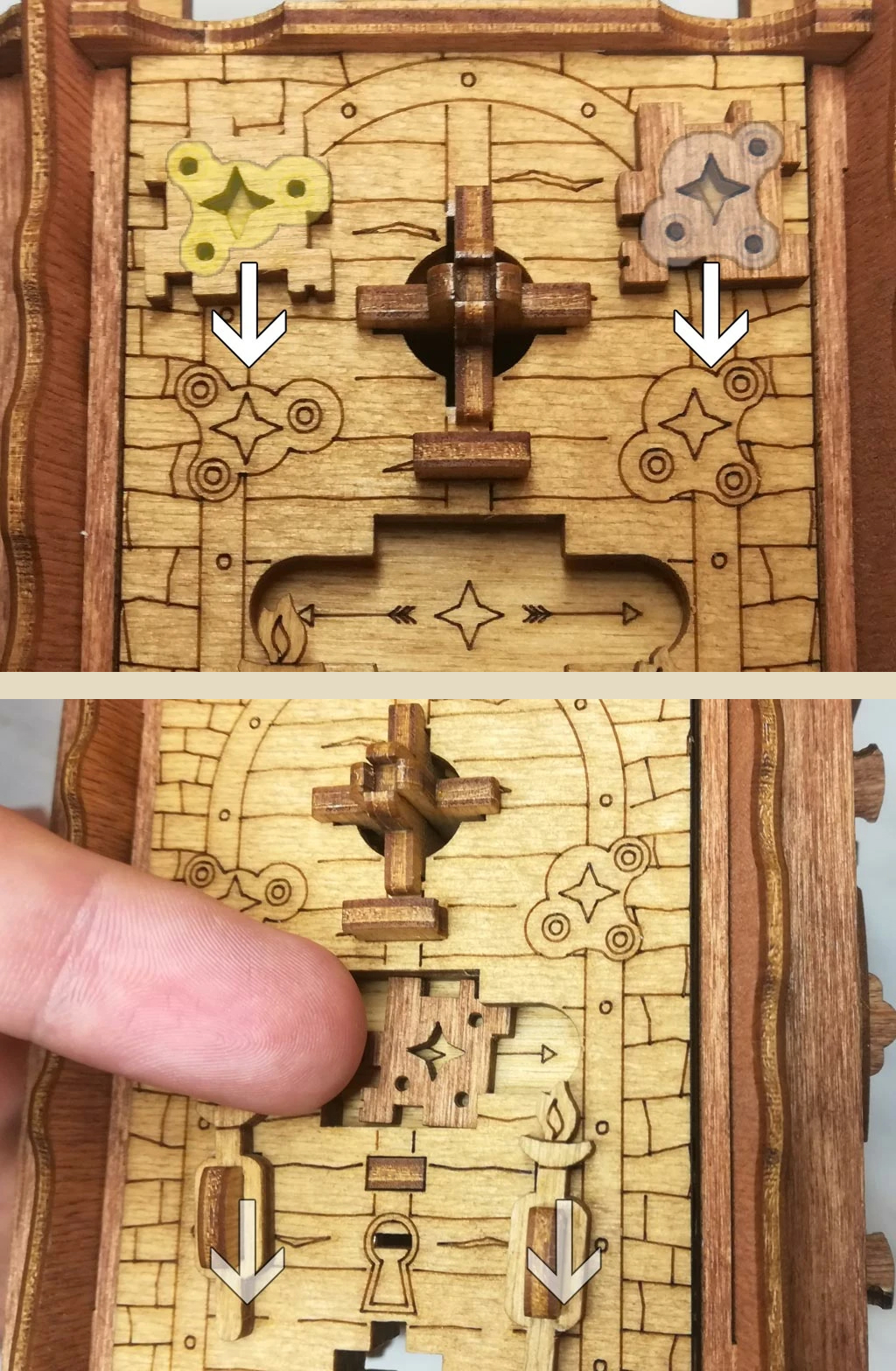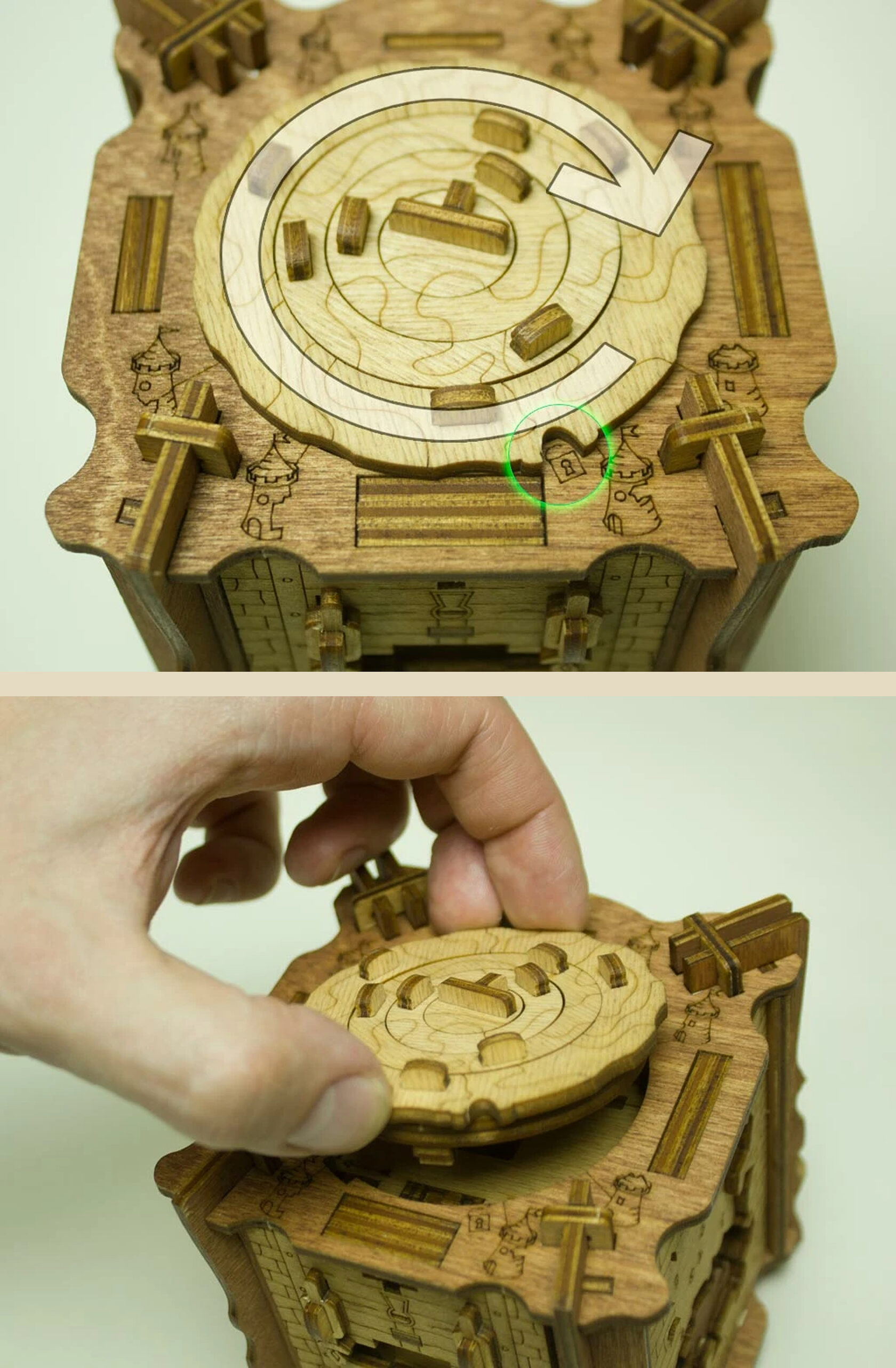 Здесь есть два отверстия, в одно из них нужно дуть, чтобы разблокировать дверцу (другое запирает его). Держите коробку горизонтально перед ртом, как будто это труба. Резко подуйте в верхнее отверстие, показанное на фото. Не нужно касаться его губами, достаточно небольшого расстояния. Во время вдувания придерживайте дверцу с обратной стороны закрытой.