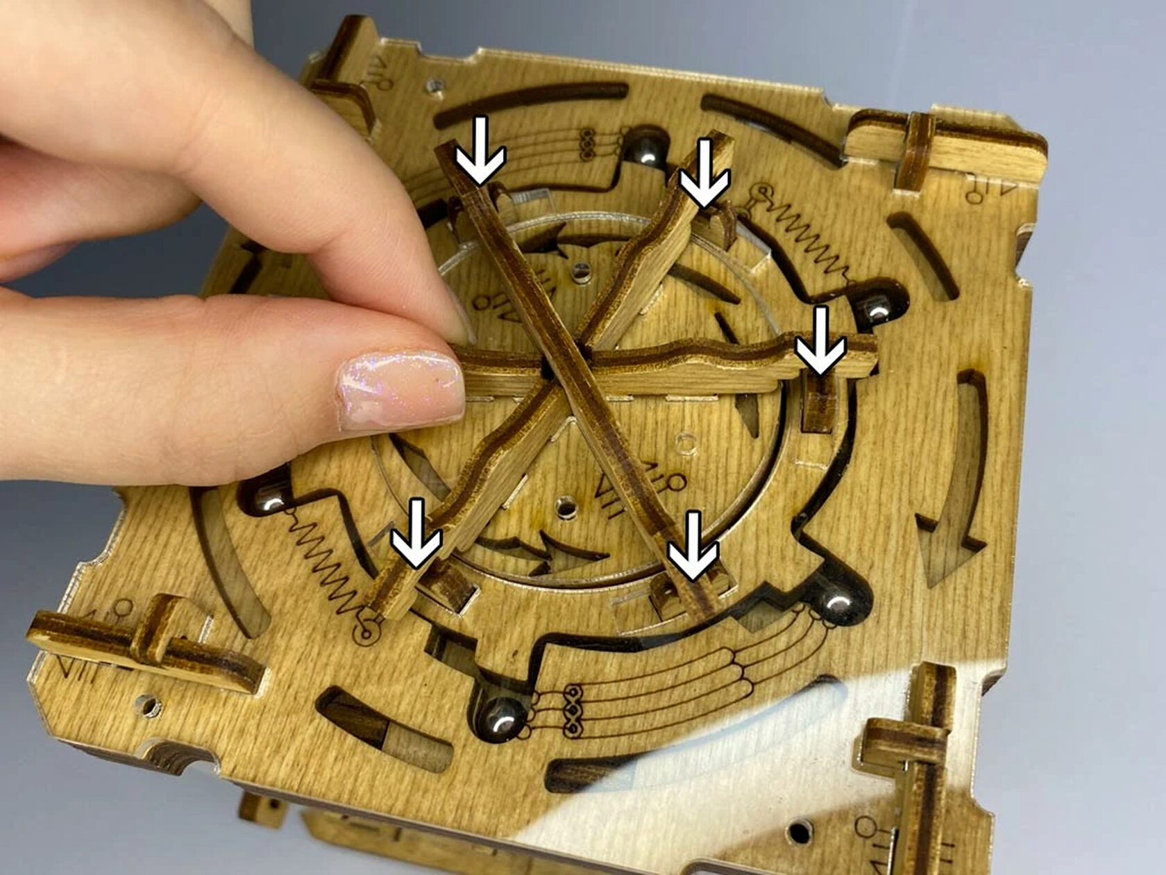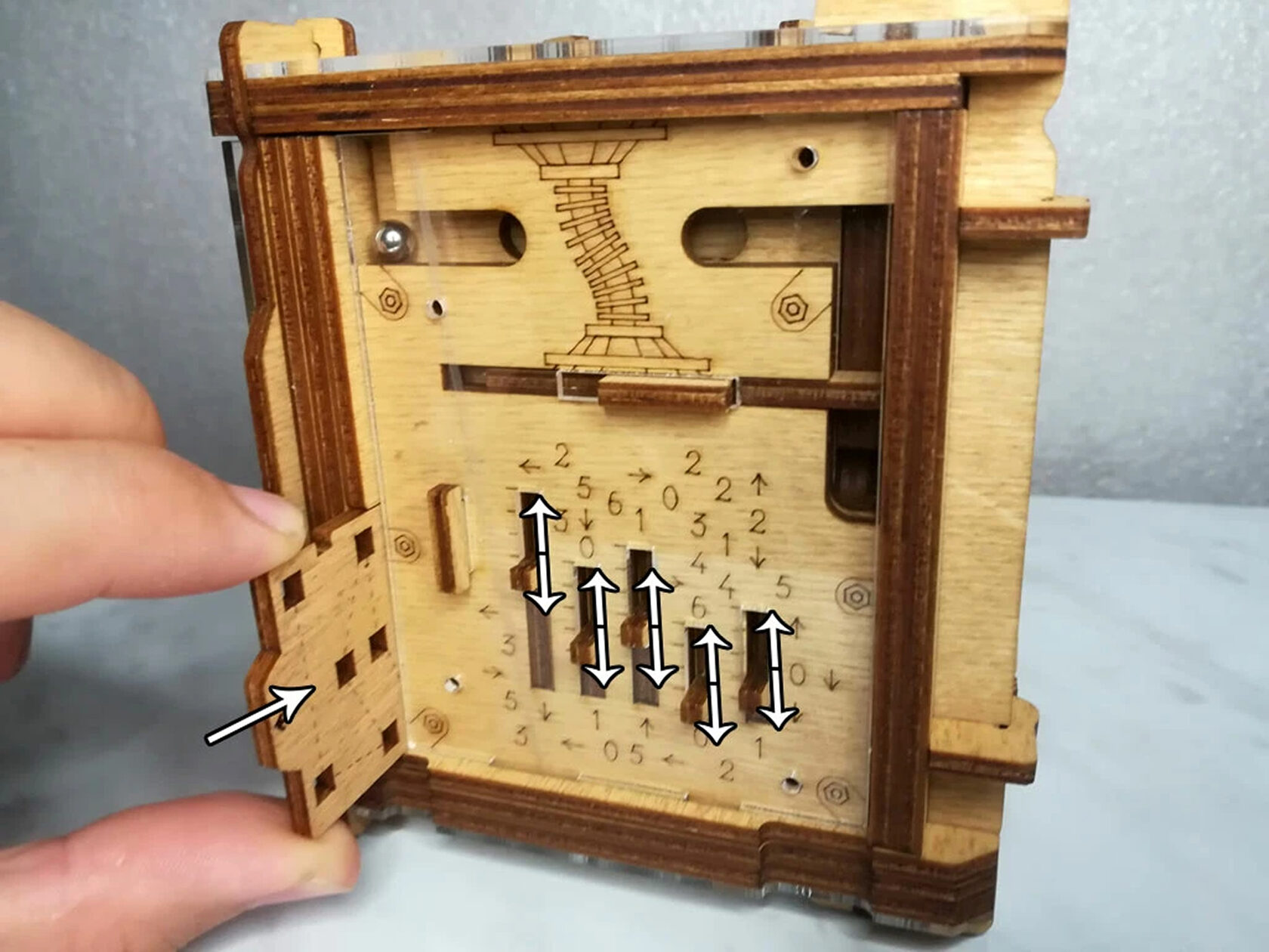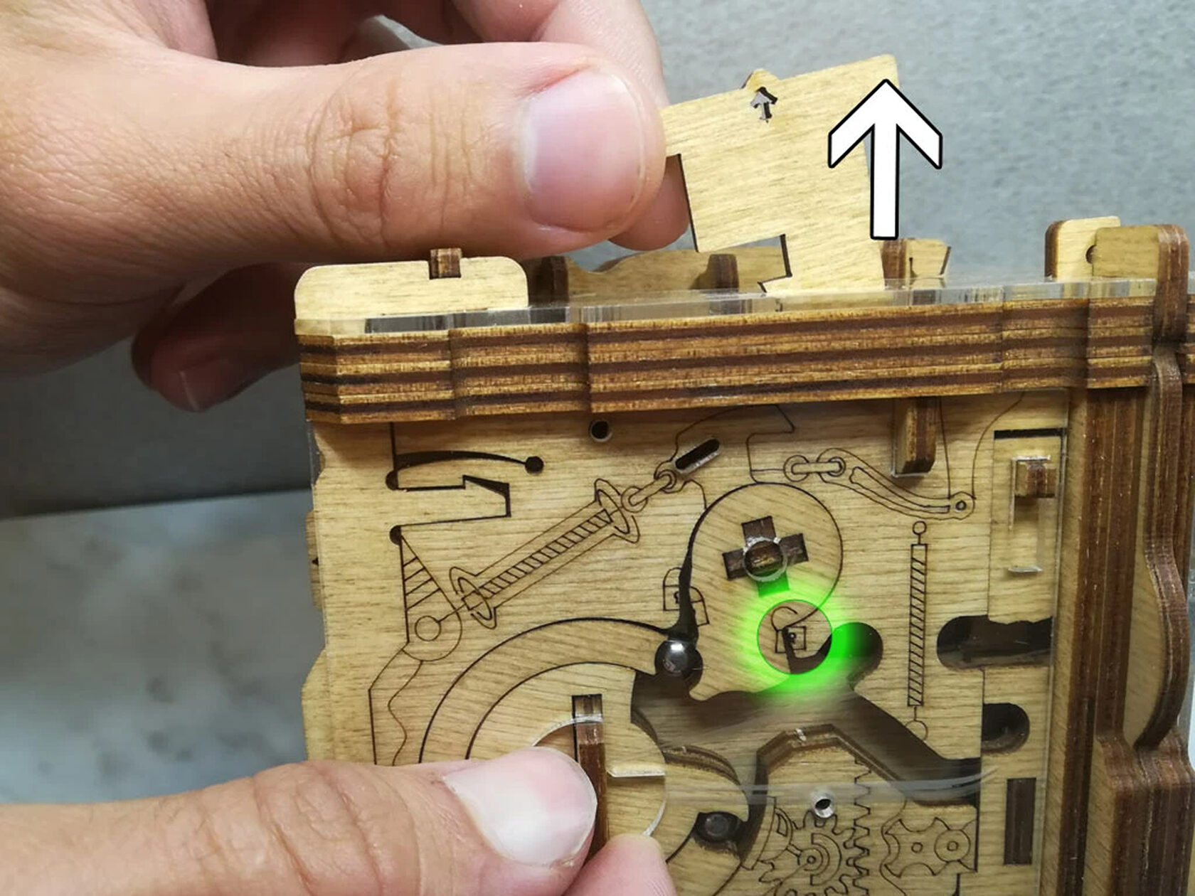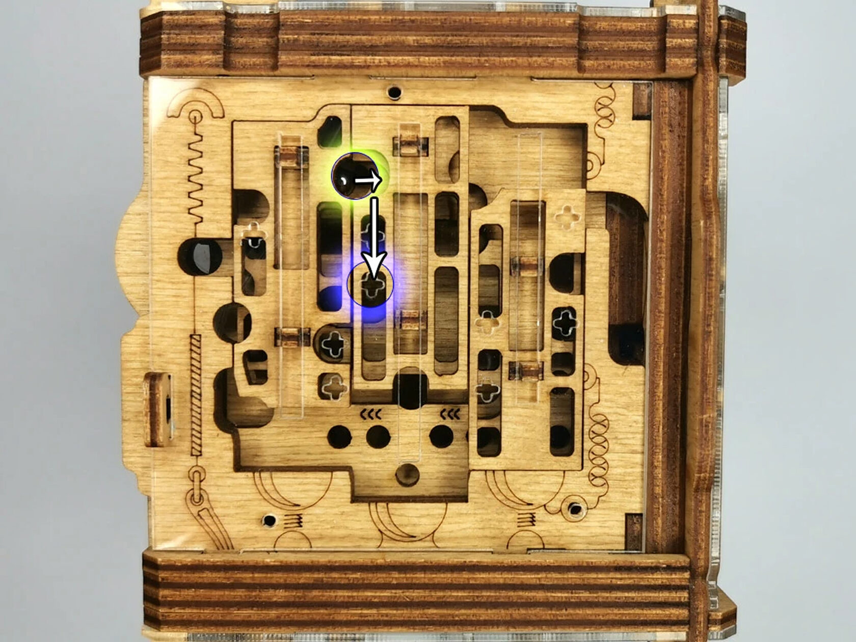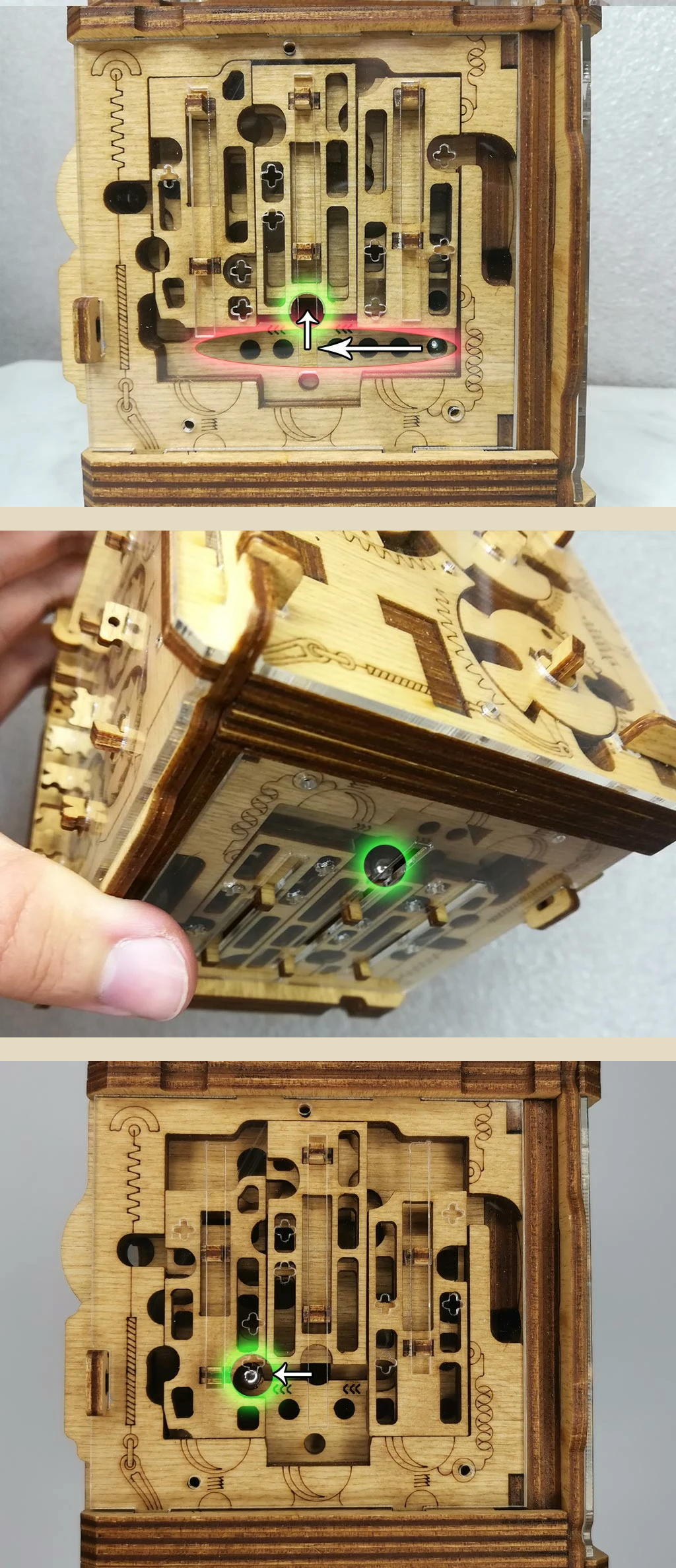 Если вы не можете найти шарик, скорее всего, он находится на самом нижнем уровне. Чтобы проверить это, сдвиньте все ползунки вверх и держите бокс вертикально, как показано ниже. Наклоняйте бокс вправо и влево — вы увидите шарик в отверстиях.