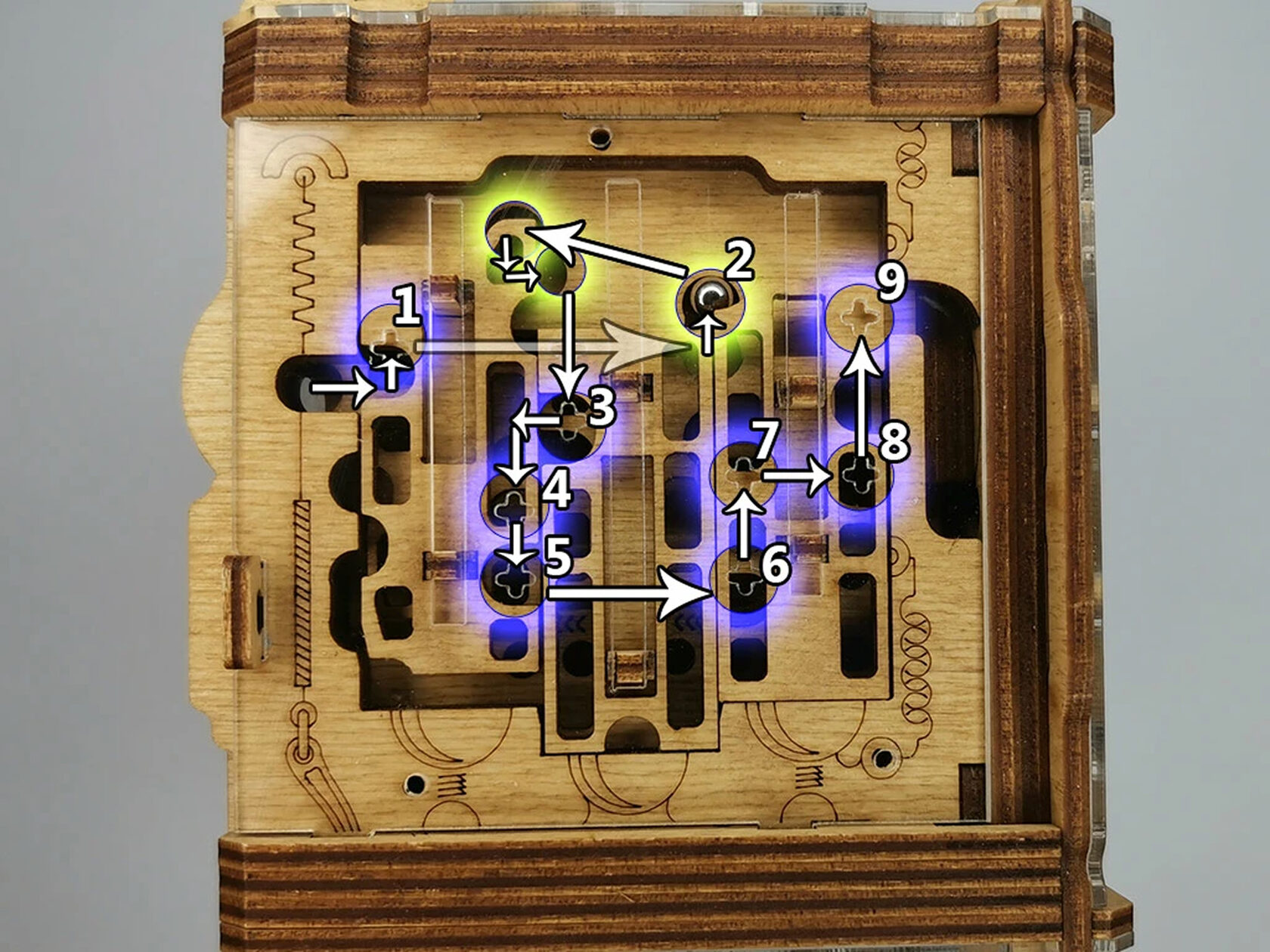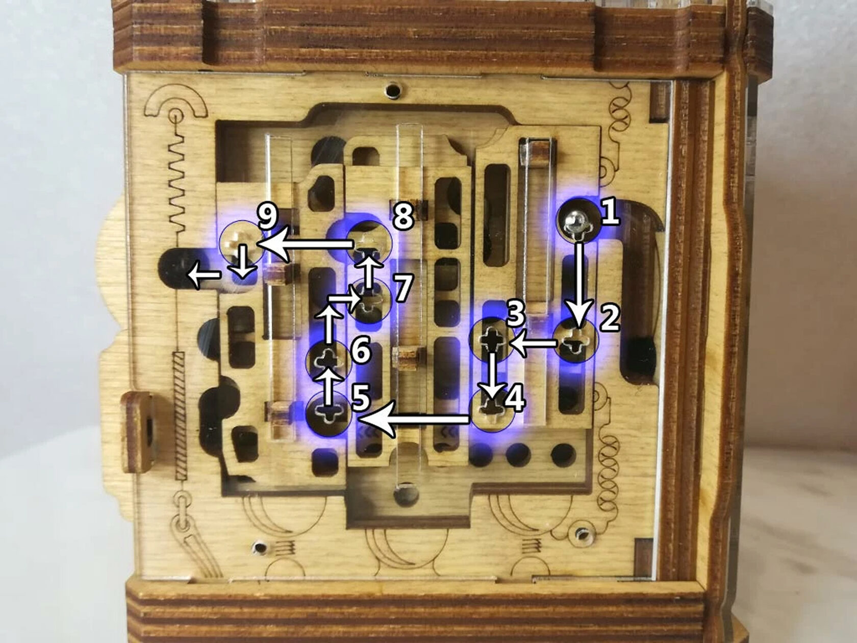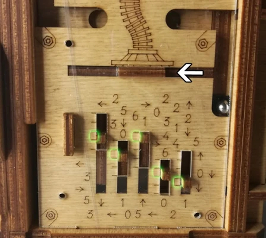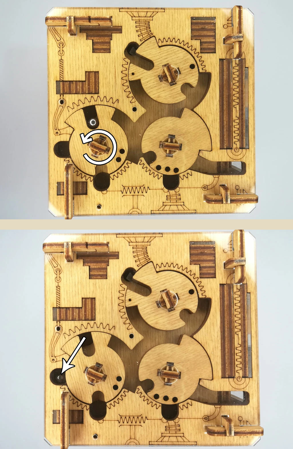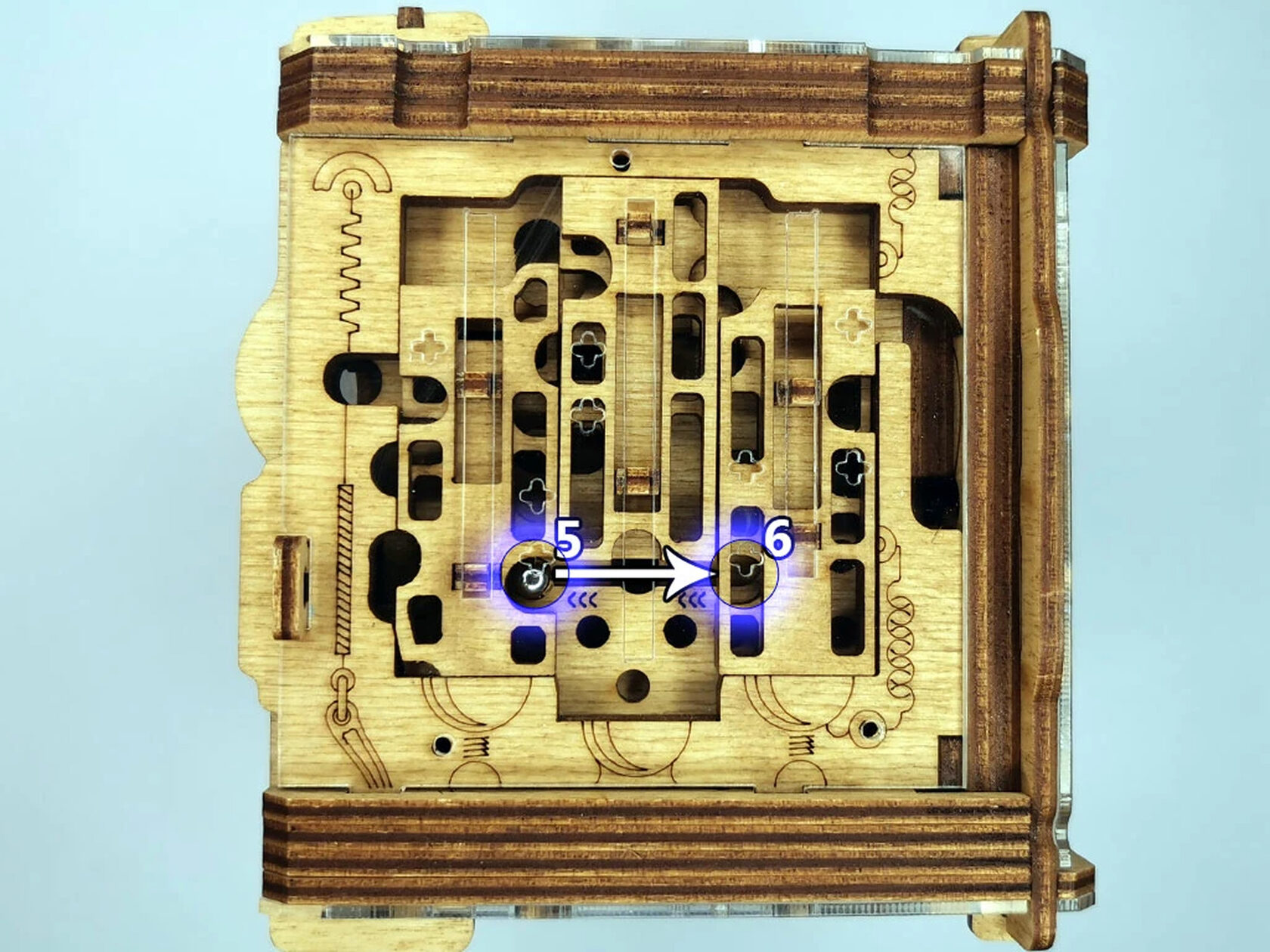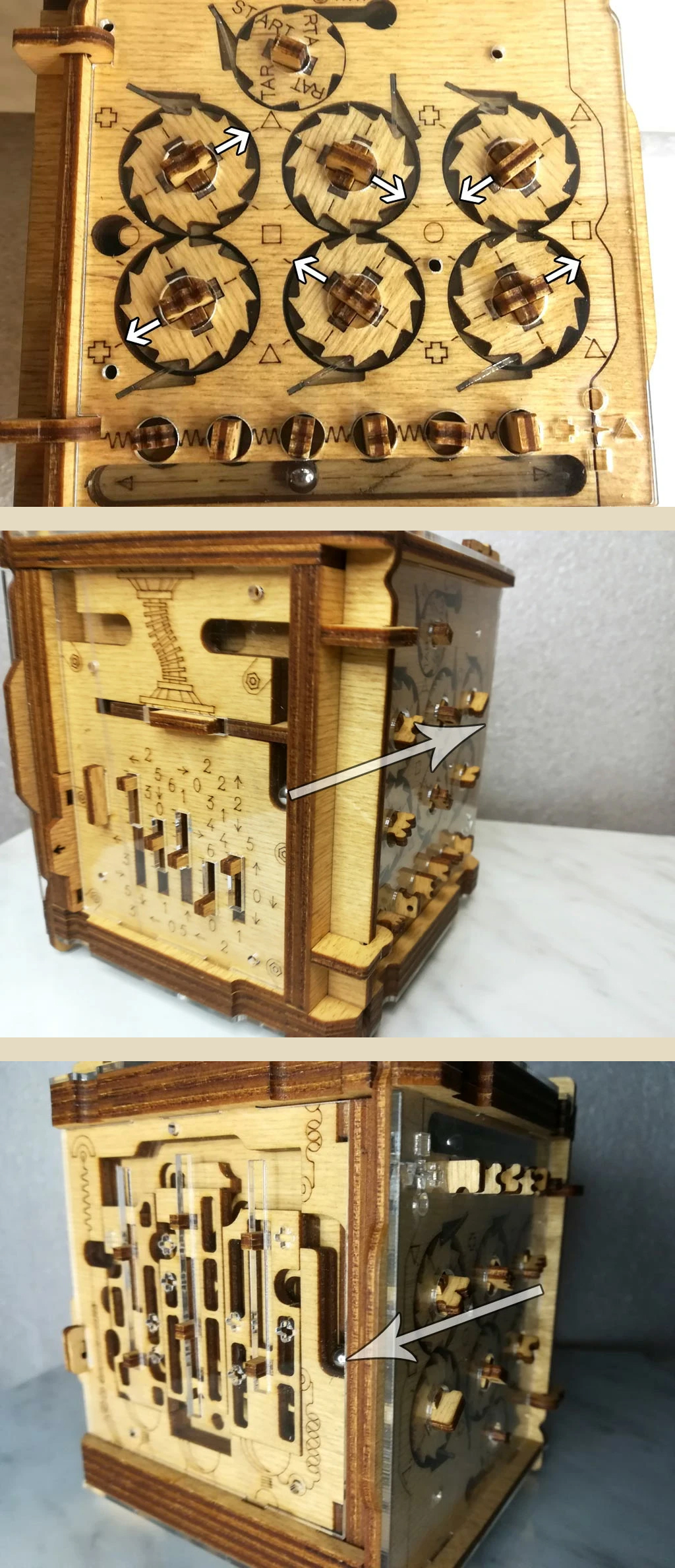 Если вы не можете найти шарик, скорее всего, он находится на самом нижнем уровне. Чтобы проверить это, сдвиньте все ползунки вверх и держите бокс вертикально, как показано ниже. Наклоняйте бокс вправо и влево — вы увидите шарик в отверстиях.