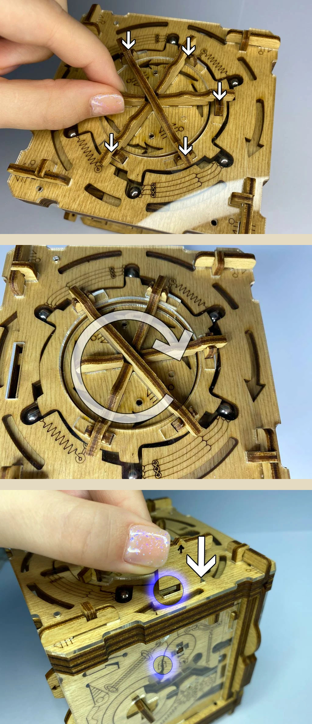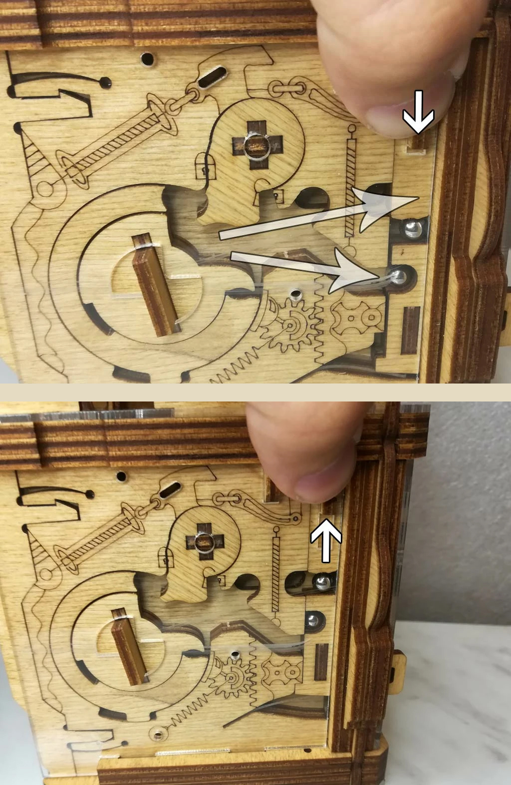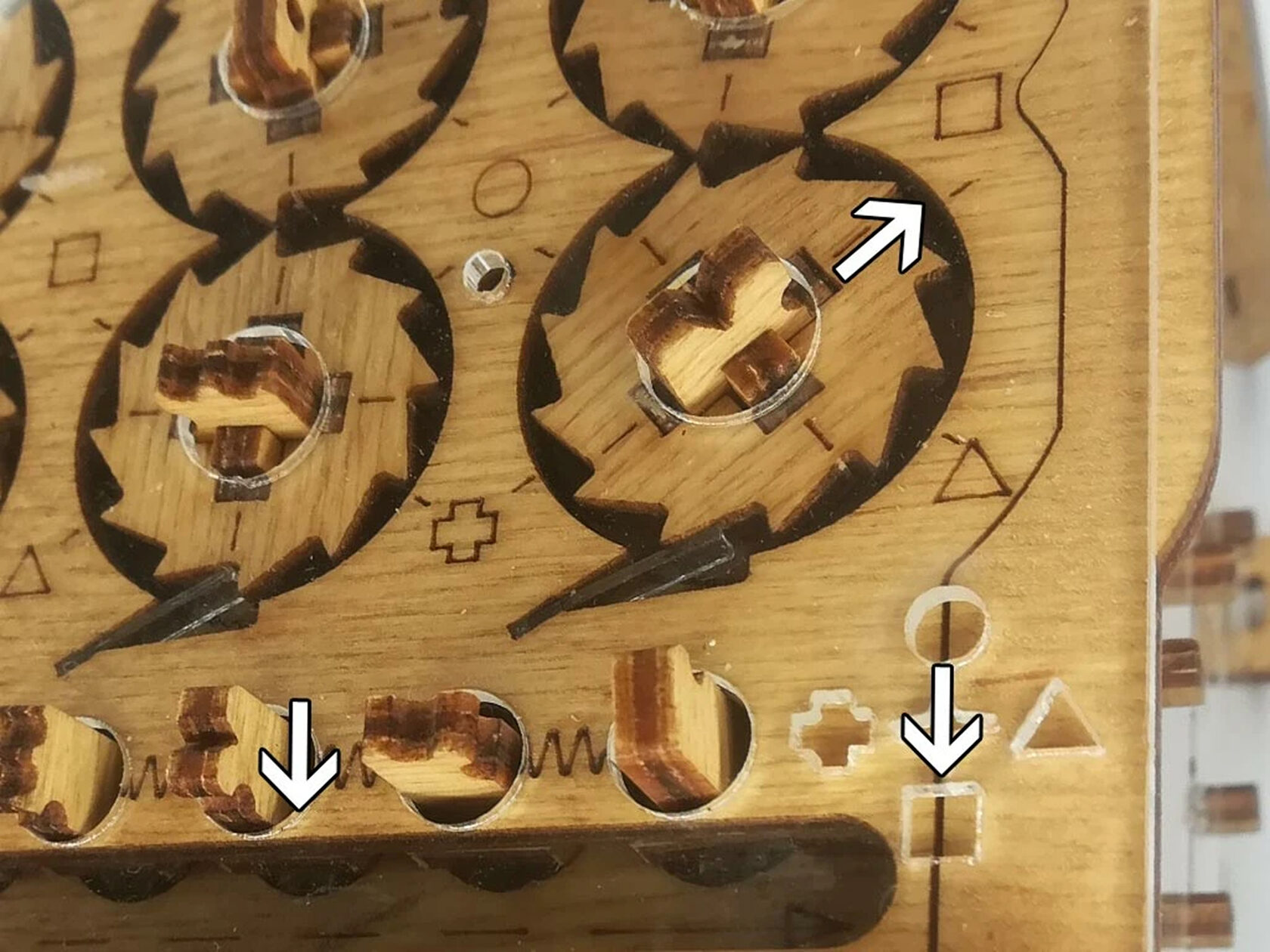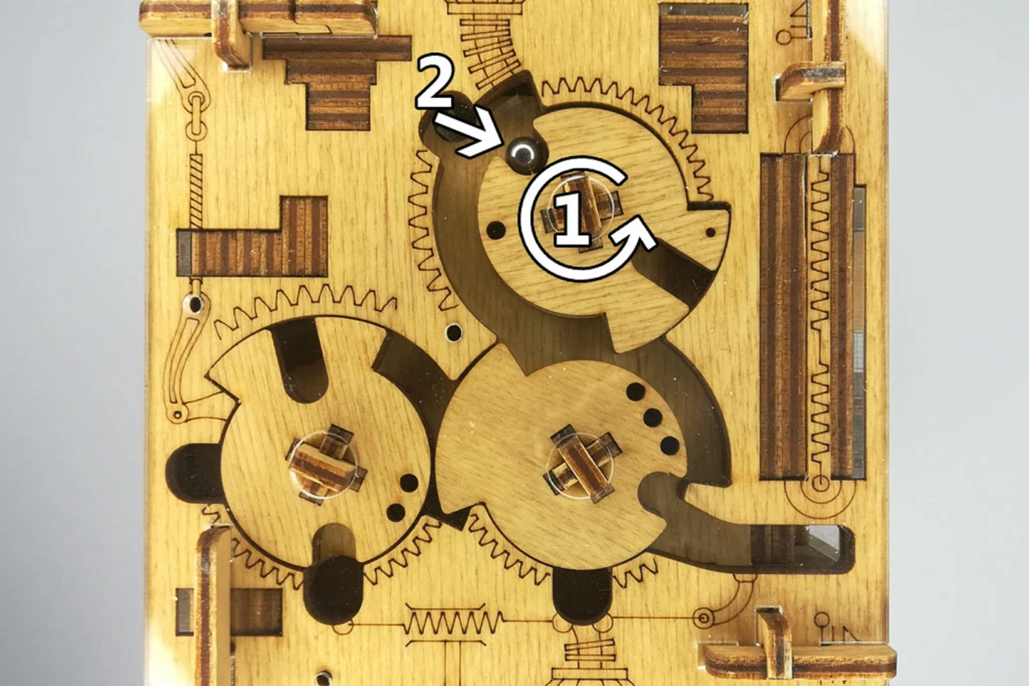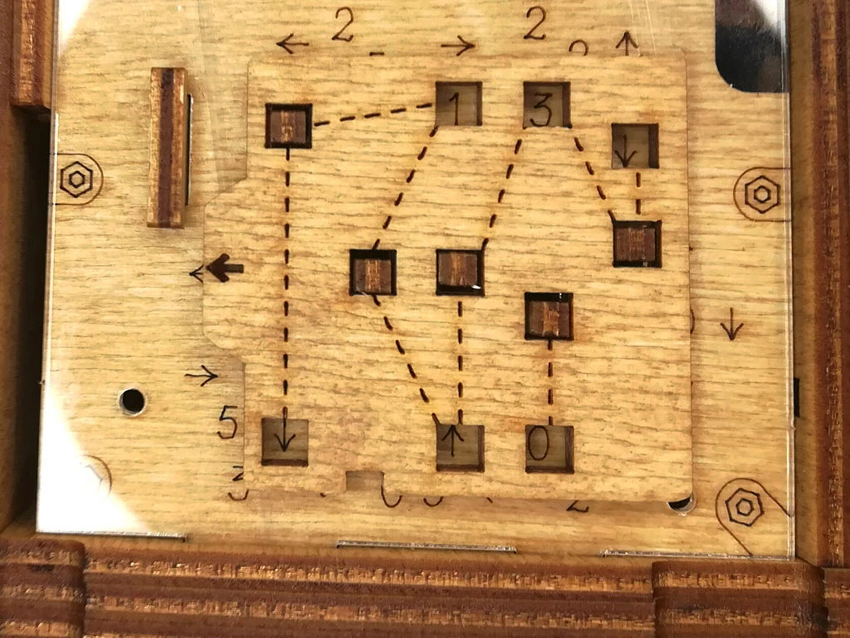 Если вы не можете найти шарик, скорее всего, он находится на самом нижнем уровне. Чтобы проверить это, сдвиньте все ползунки вверх и держите бокс вертикально, как показано ниже. Наклоняйте бокс вправо и влево — вы увидите шарик в отверстиях.