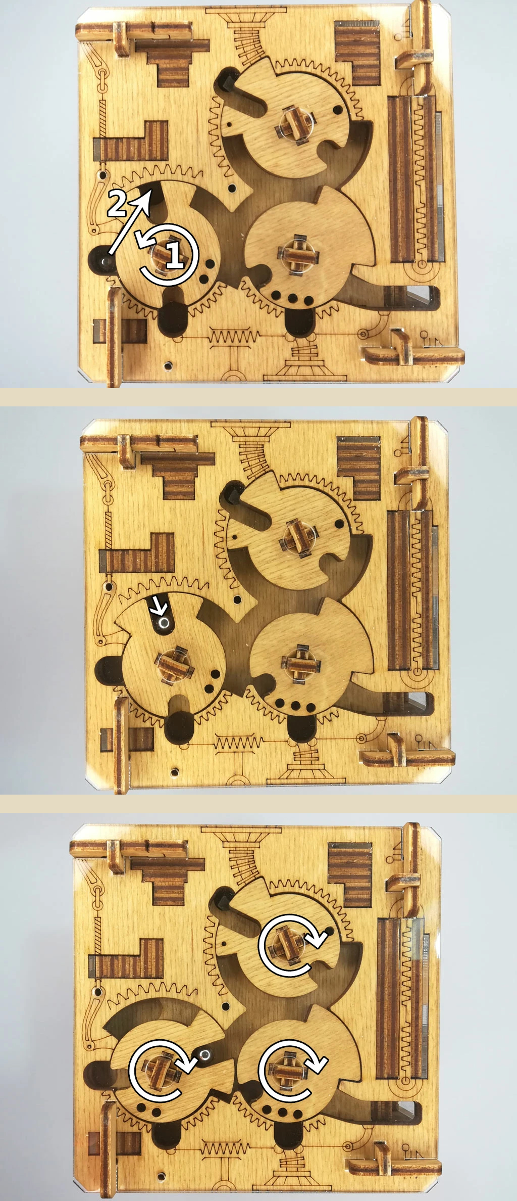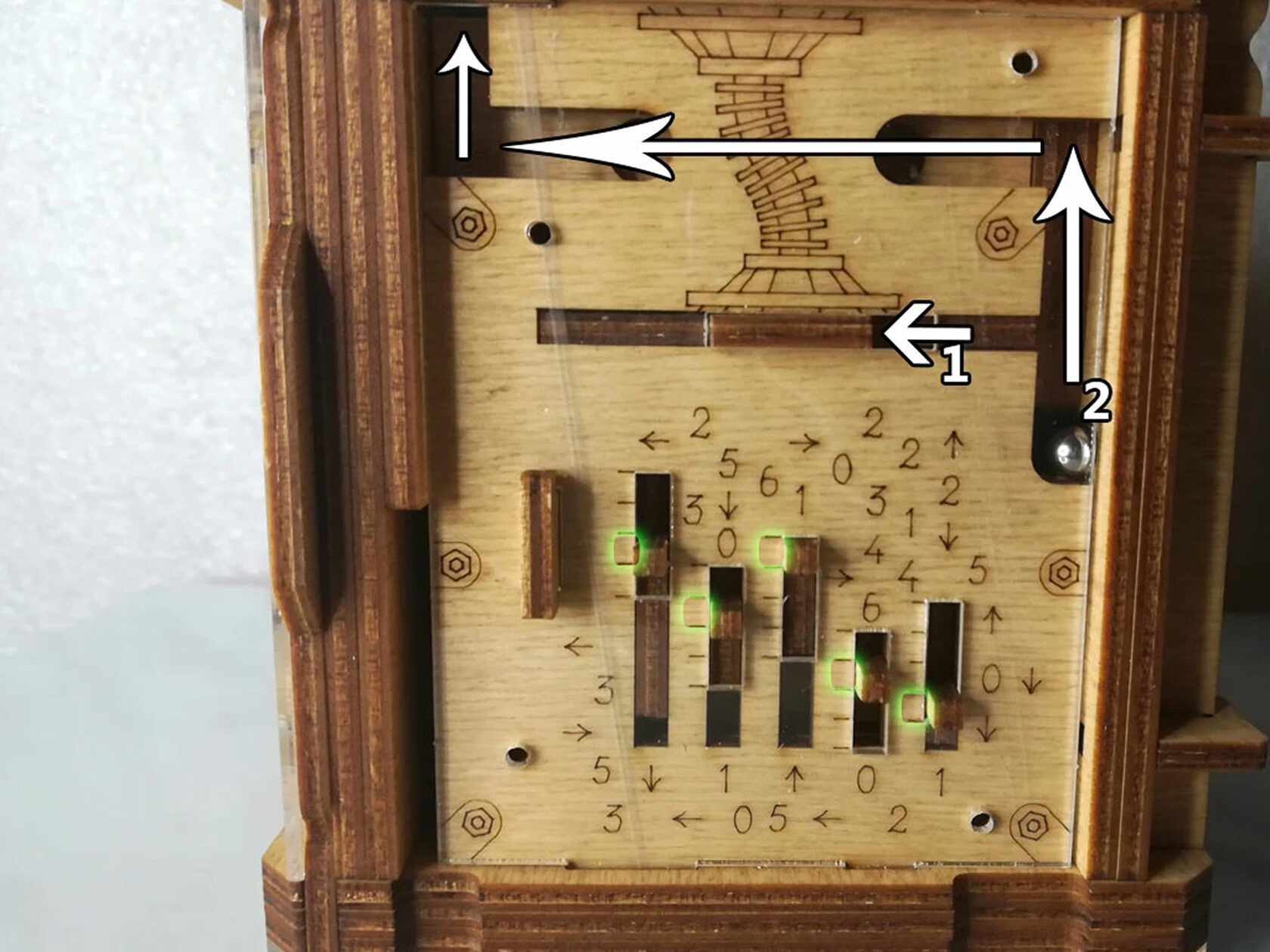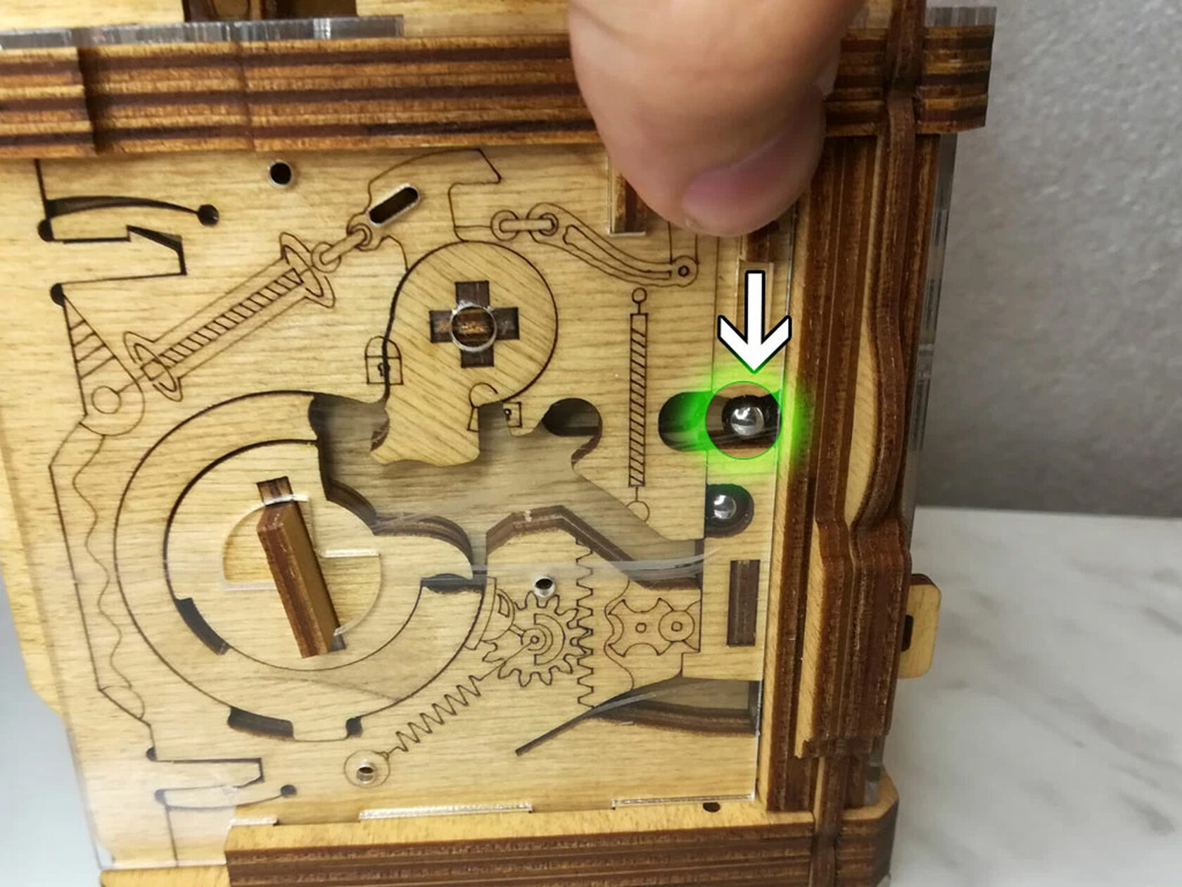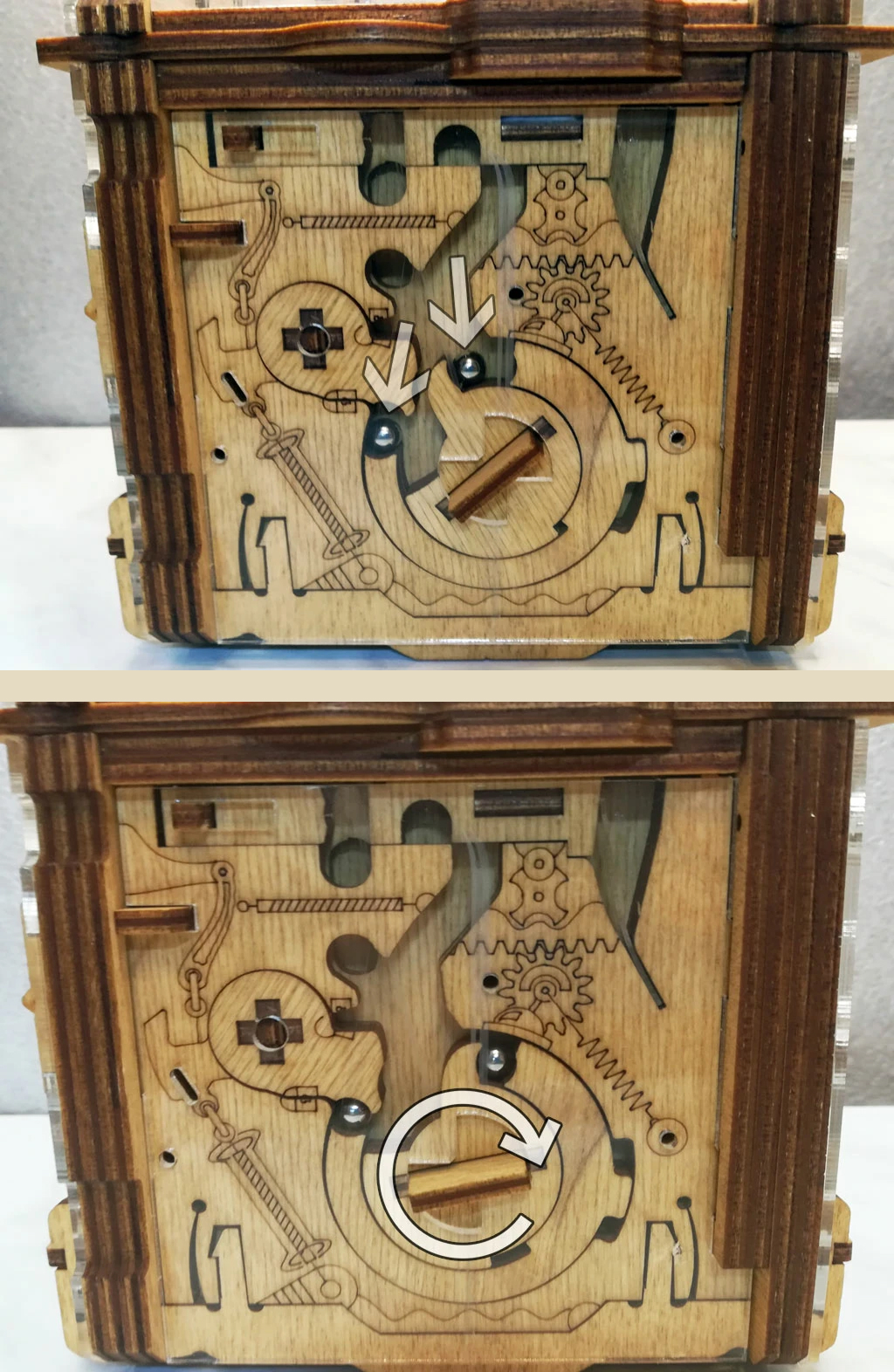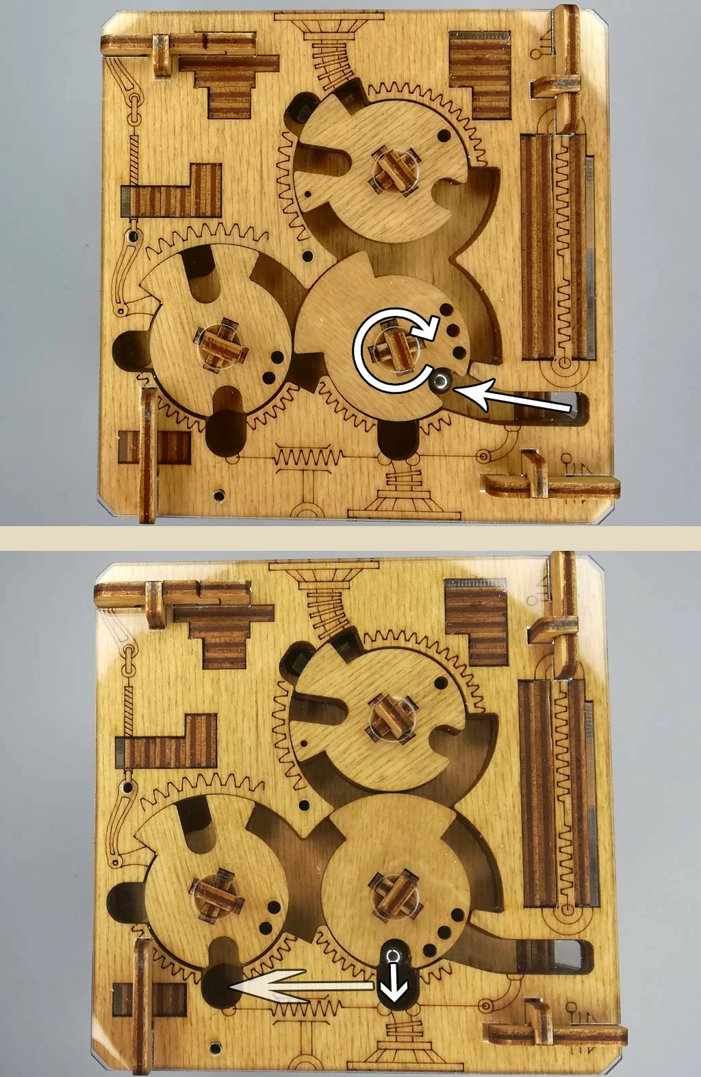 Если вы не можете найти шарик, скорее всего, он находится на самом нижнем уровне. Чтобы проверить это, сдвиньте все ползунки вверх и держите бокс вертикально, как показано ниже. Наклоняйте бокс вправо и влево — вы увидите шарик в отверстиях.