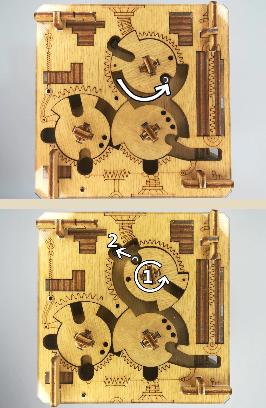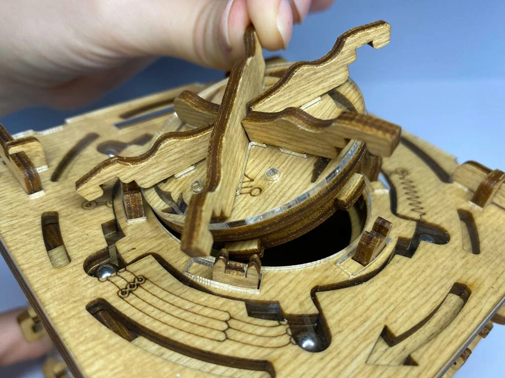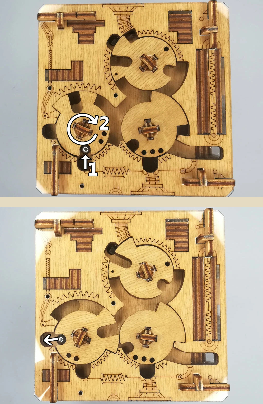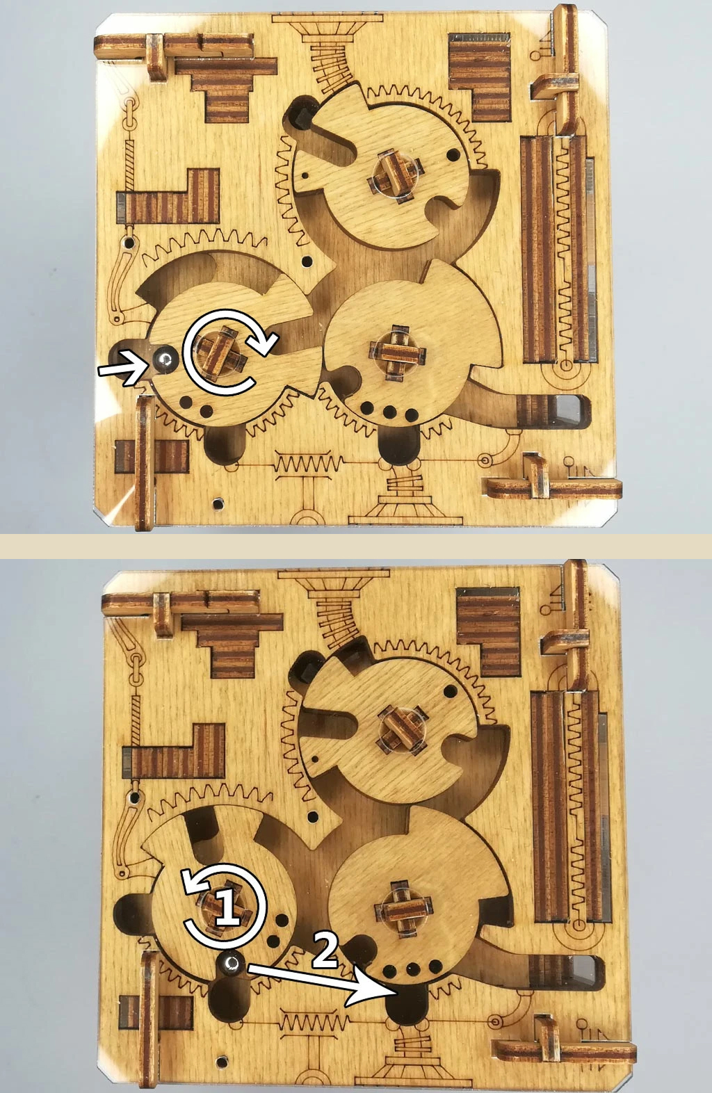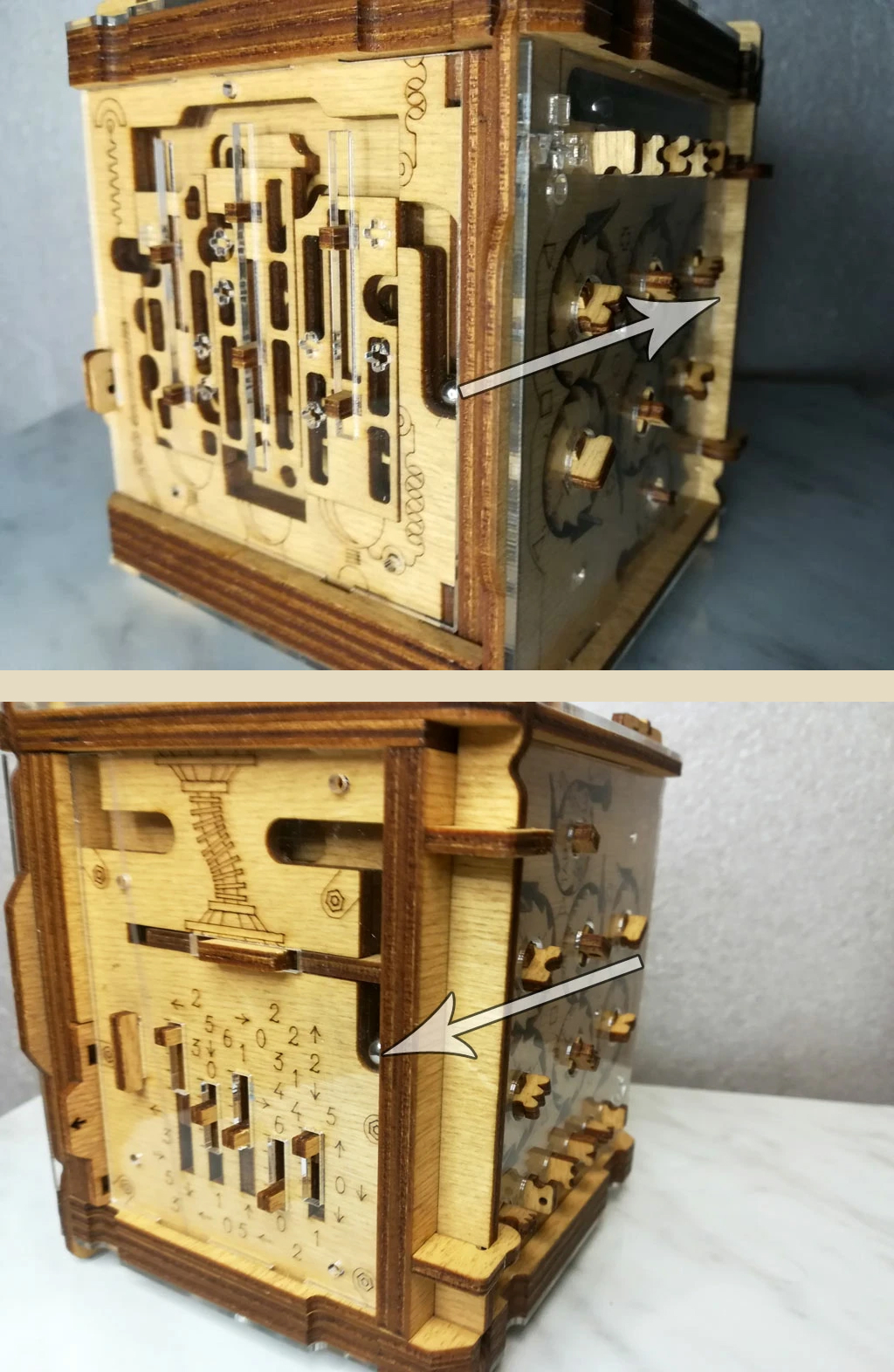 Если вы не можете найти шарик, скорее всего, он находится на самом нижнем уровне. Чтобы проверить это, сдвиньте все ползунки вверх и держите бокс вертикально, как показано ниже. Наклоняйте бокс вправо и влево — вы увидите шарик в отверстиях.