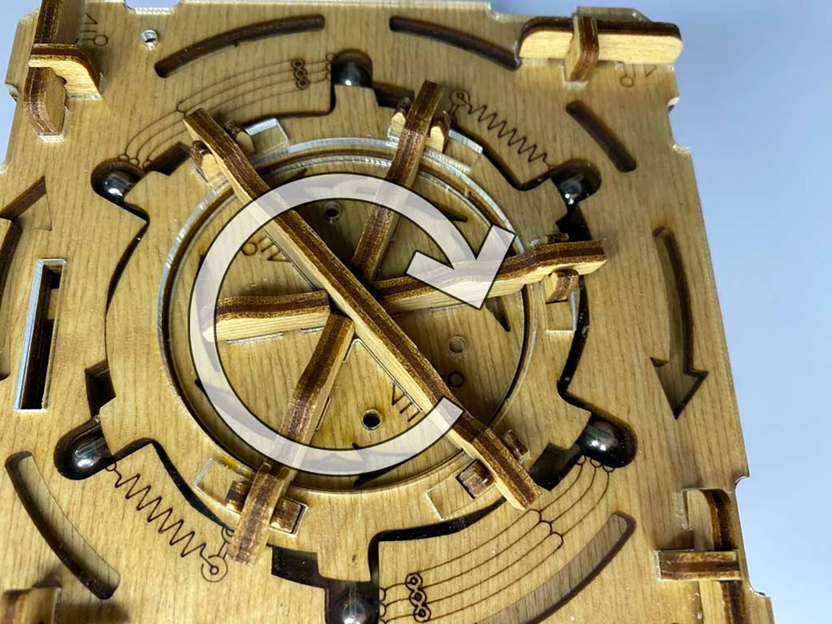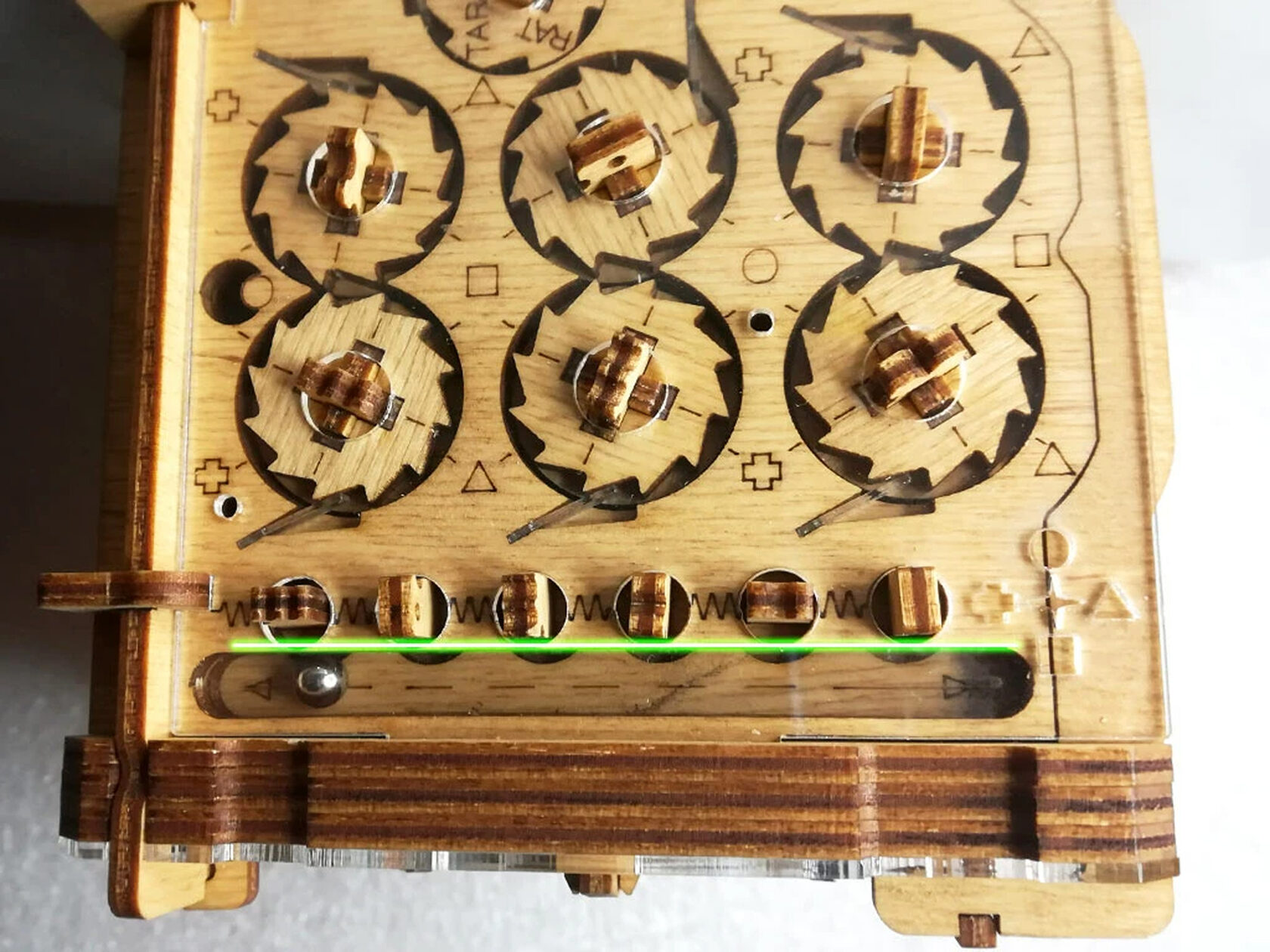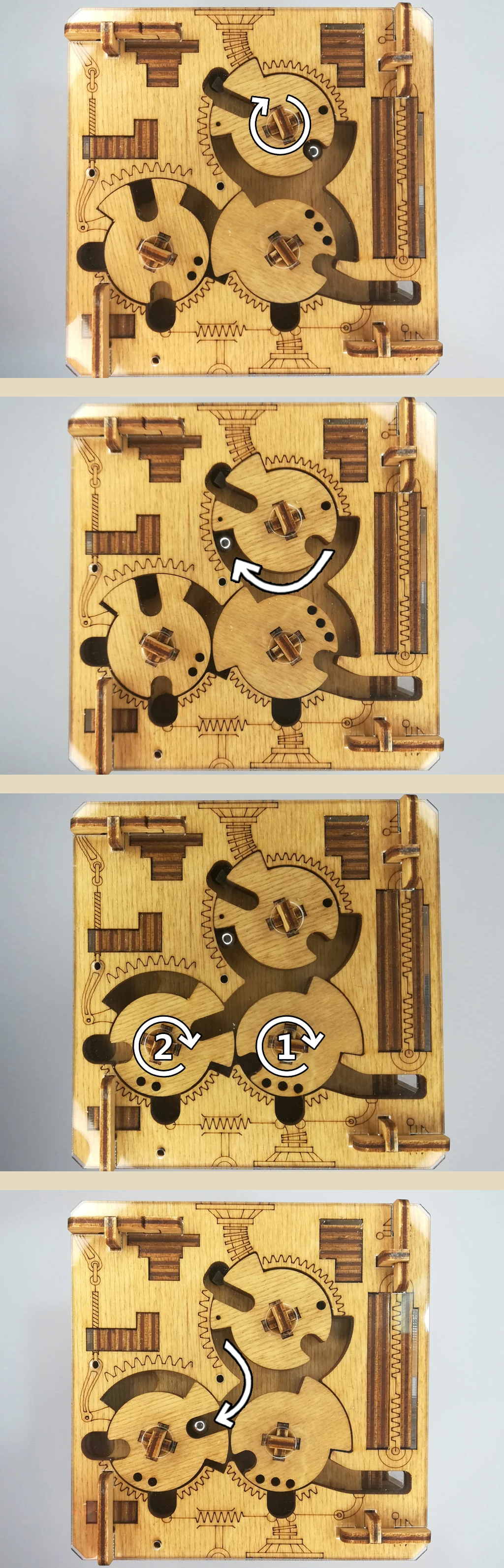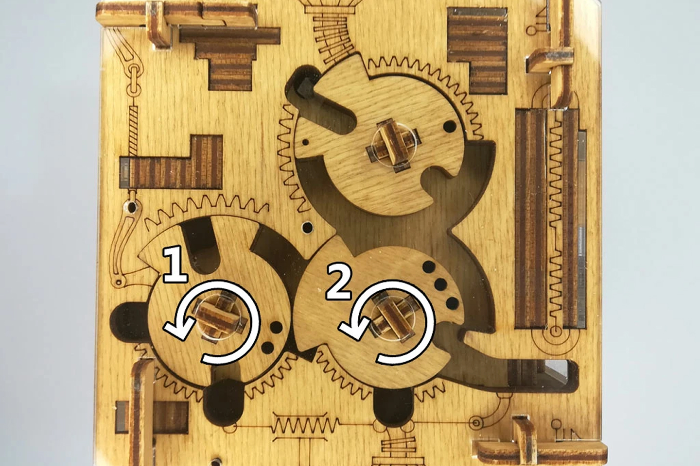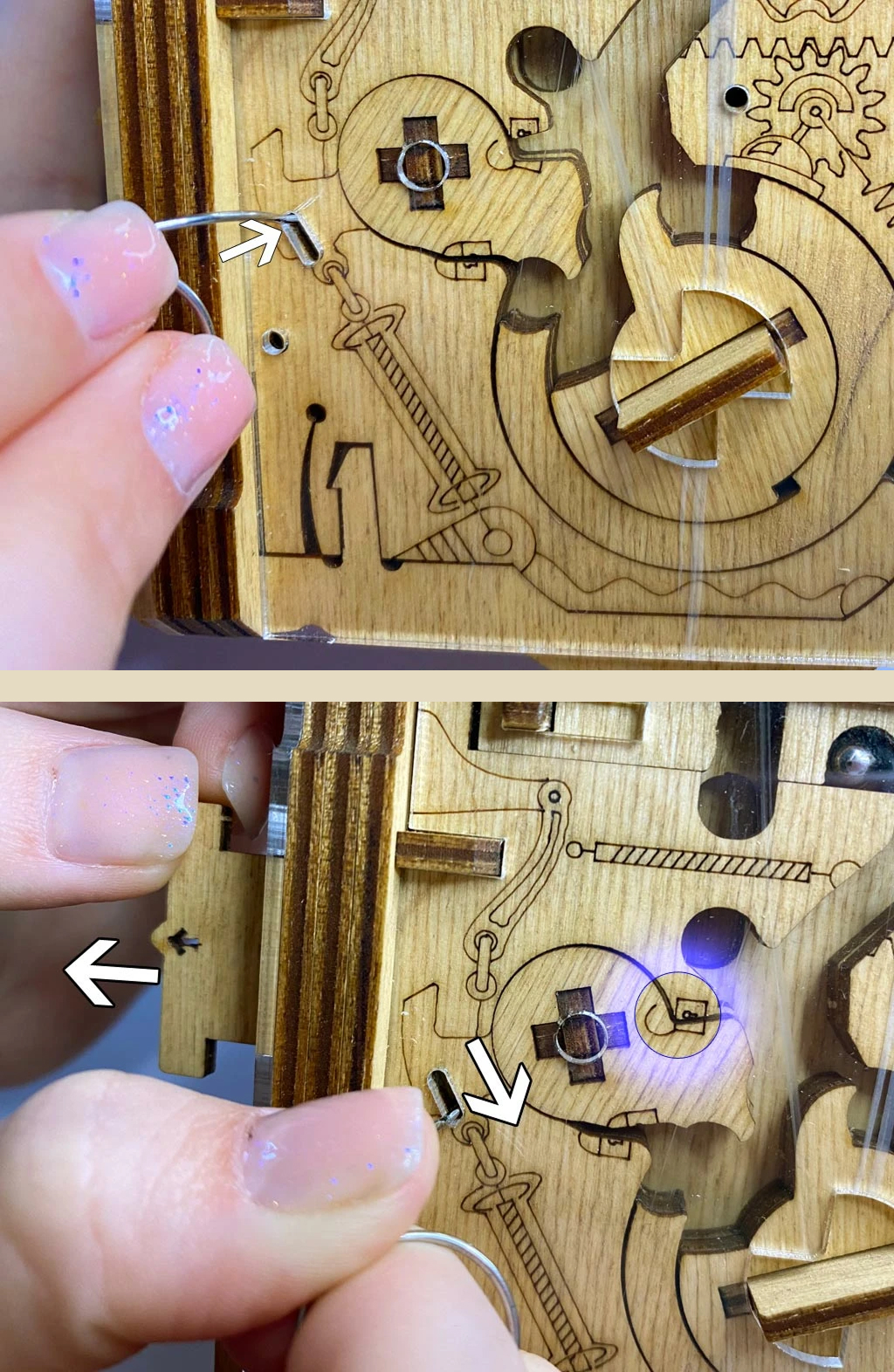 Если вы не можете найти шарик, скорее всего, он находится на самом нижнем уровне. Чтобы проверить это, сдвиньте все ползунки вверх и держите бокс вертикально, как показано ниже. Наклоняйте бокс вправо и влево — вы увидите шарик в отверстиях.