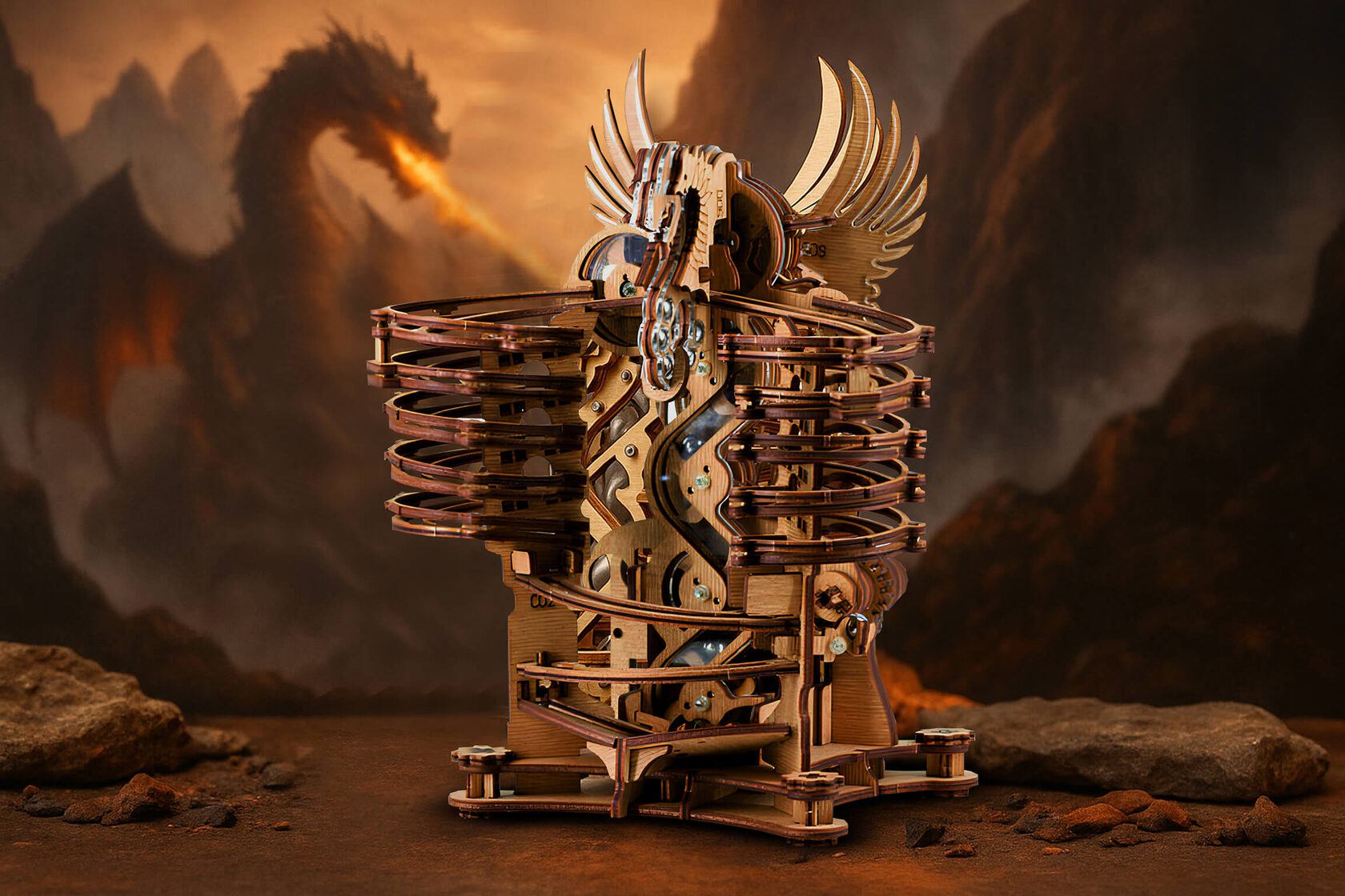ДЕРЕВЯННЫЙ КОНСТРУКТОР «МАРБЛ — ДРАКОН» — сложный конструктор со встроенной трек-системой для катания металлических шаров. В конструкцию встроена ручка, провернув которую можно запустить механизм. Восьмой уровень сложности.