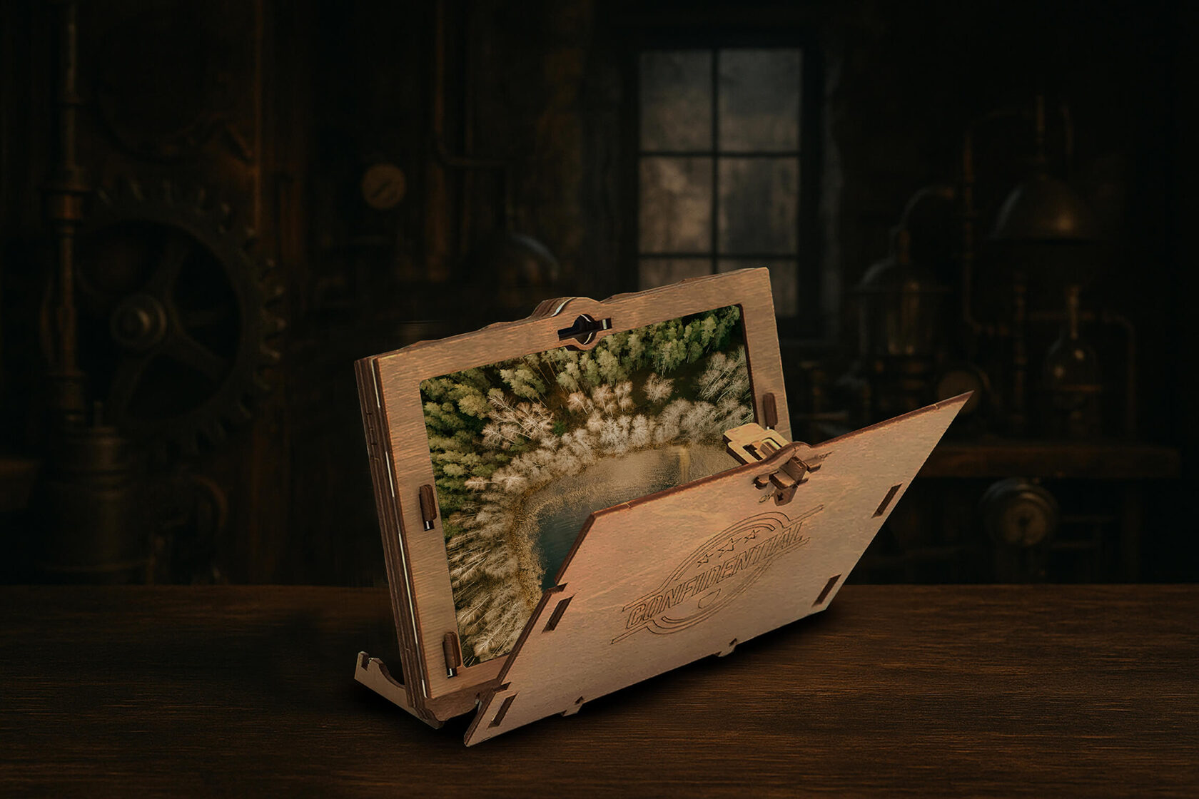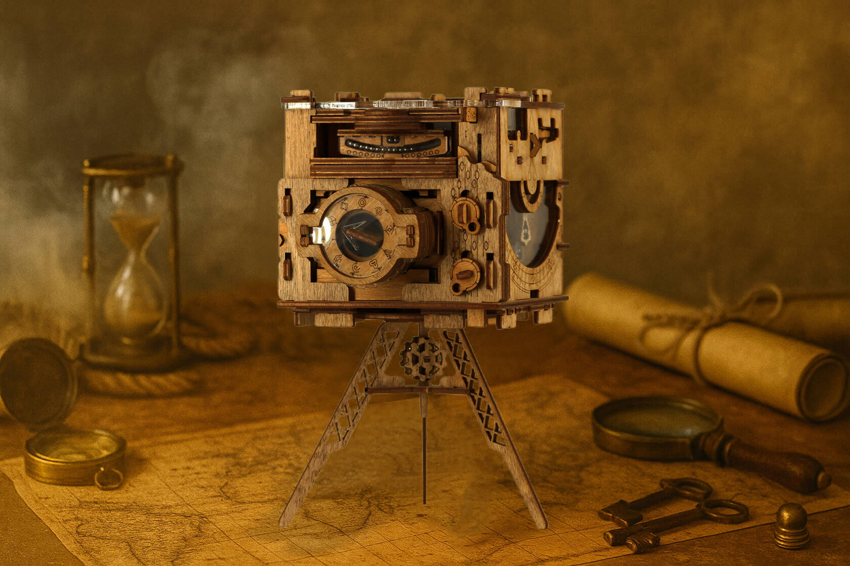 ДЕРЕВЯННАЯ ГОЛОВОЛОМКА «КВЕСТБОКС: ФОТОАППАРАТ ШЕРЛОКА ХОЛМСА» — самый сложный квестбокс в нашей линейке. Это настоящий вызов для умов. Здесь можно разгадывать загадки как одному, так и в компании единомышленников. Внутри сложные механизмы, семь загадок и тайник. В комплекте идут ножки для фотоаппарата. В подарок мы положили карандашницу «221В». Десятый уровень сложности.