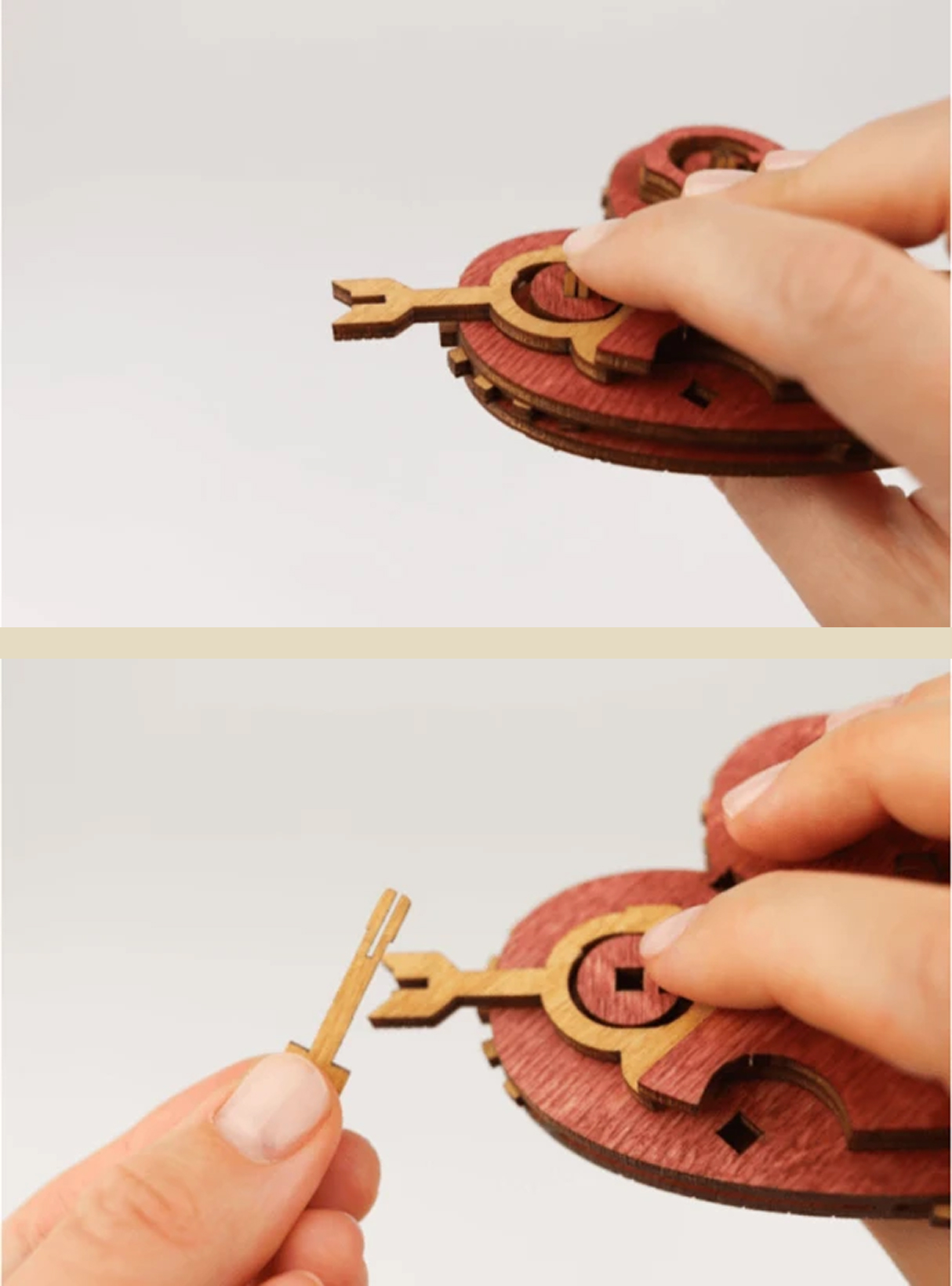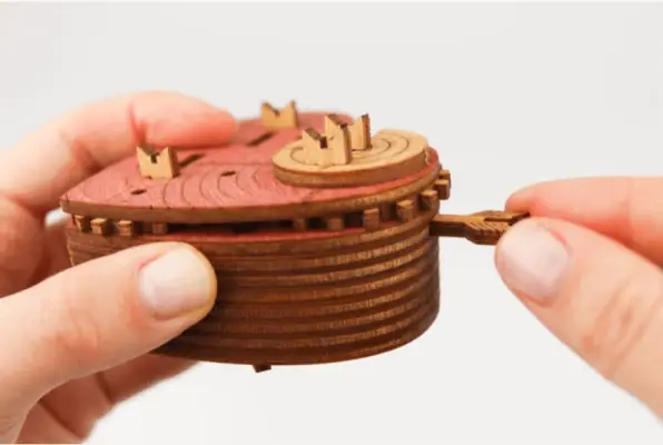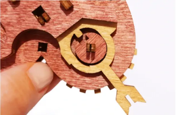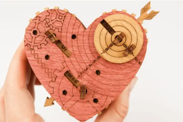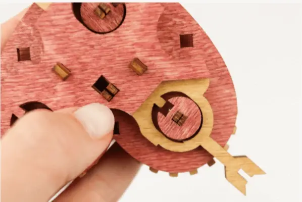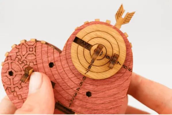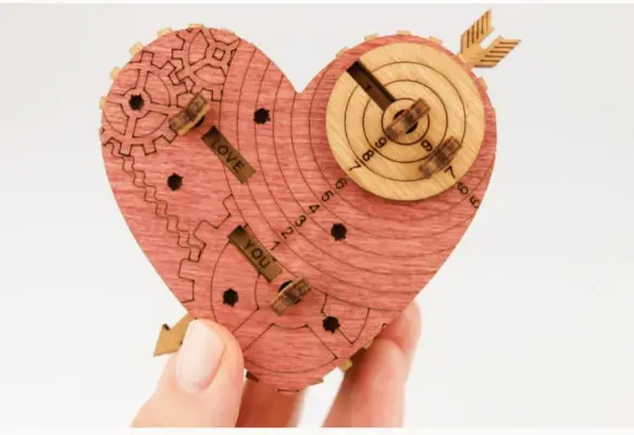 Чтобы изменить комбинацию, вам нужно перевернуть крышку сердца, аккуратно нажать на кончик стрелы рядом со словом, которое вы хотите изменить и затем вытащить стрелу из крышки. Это действие освободит маленькую круглую шайбу, удерживаемую штифтом, и шестеренку со словами.