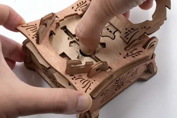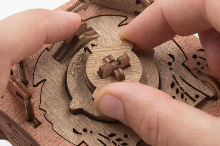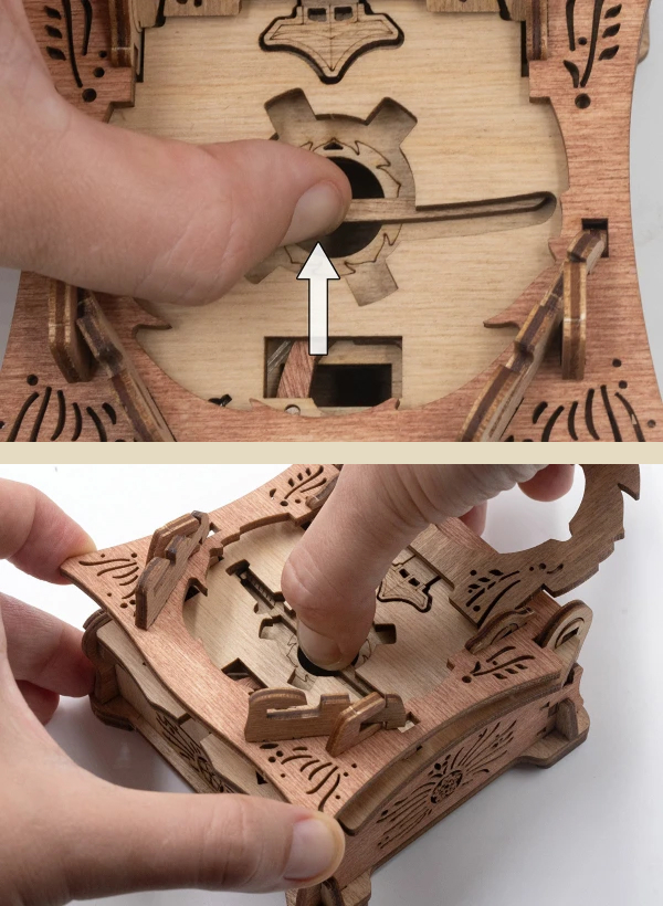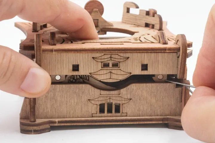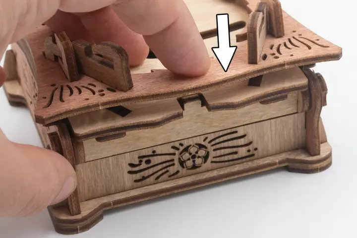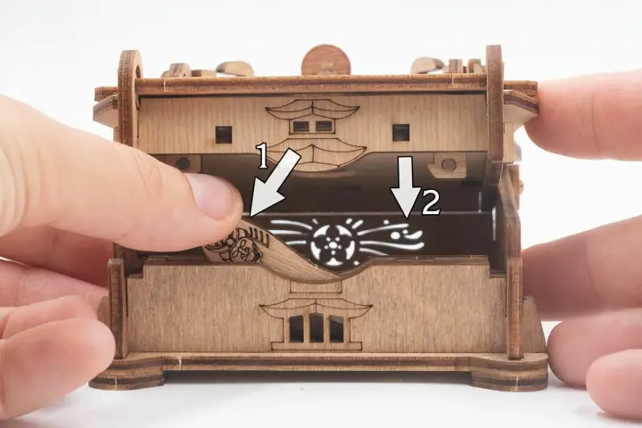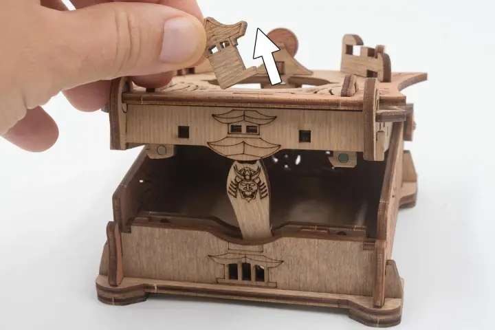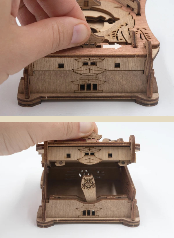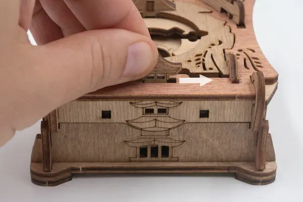 Закройте крышки. Вставьте ключ от пагоды в прорезь над рисунком пагоды и сдвиньте его вправо до щелчка – крышка разблокируется. Потяните ее вверх, чтобы открыть секретное отделение.