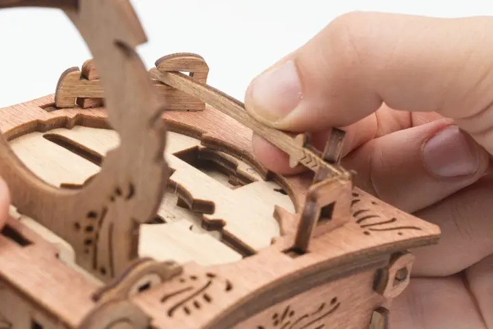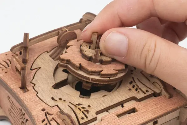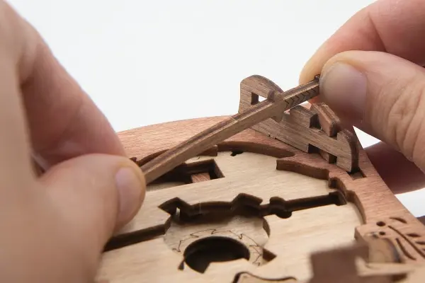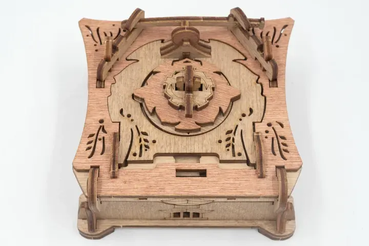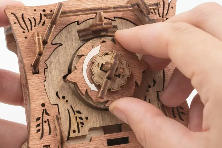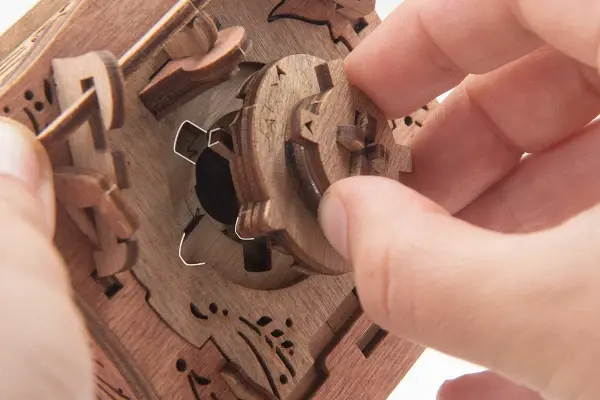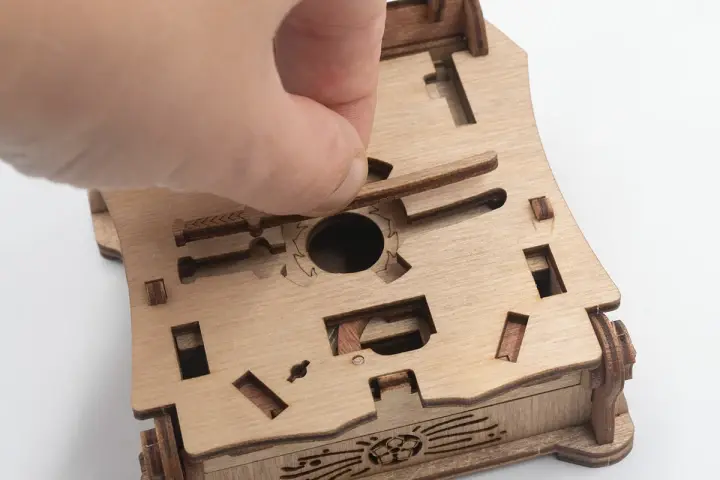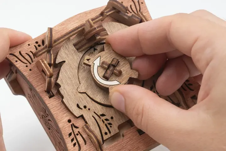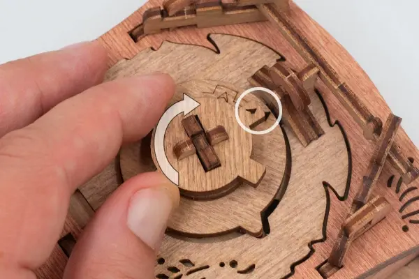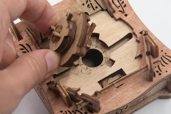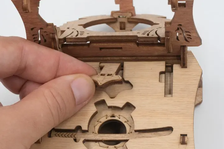 Закройте крышки. Вставьте ключ от пагоды в прорезь над рисунком пагоды и сдвиньте его вправо до щелчка – крышка разблокируется. Потяните ее вверх, чтобы открыть секретное отделение.