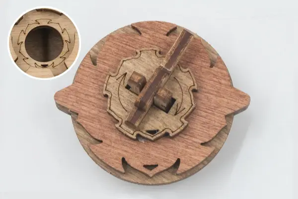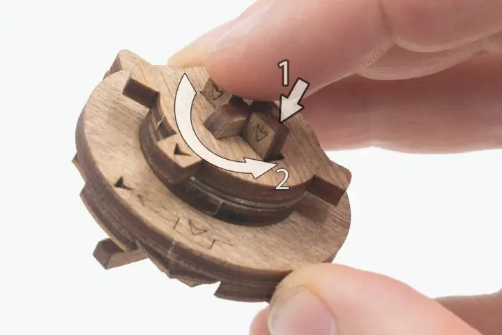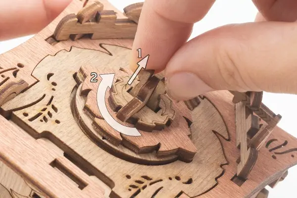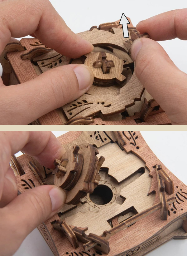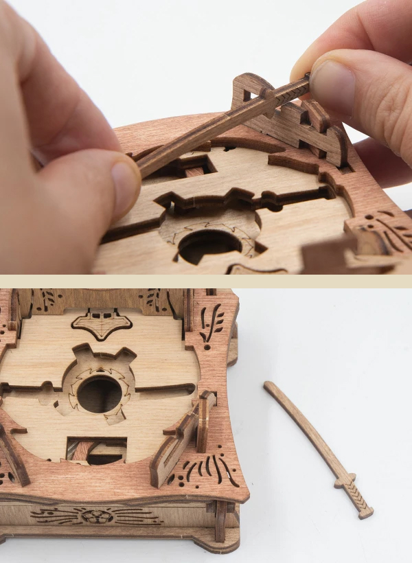 Закройте крышки . Вставьте ключ от пагоды в прорезь над рисунком пагоды и сдвиньте его вправо до щелчка – крышка разблокируется. Потяните ее вверх, чтобы открыть секретное отделение.