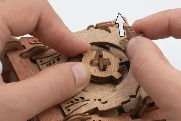 Потяните вверх часть с изображением горы и солнца, чтобы разблокировать круглую крышку.