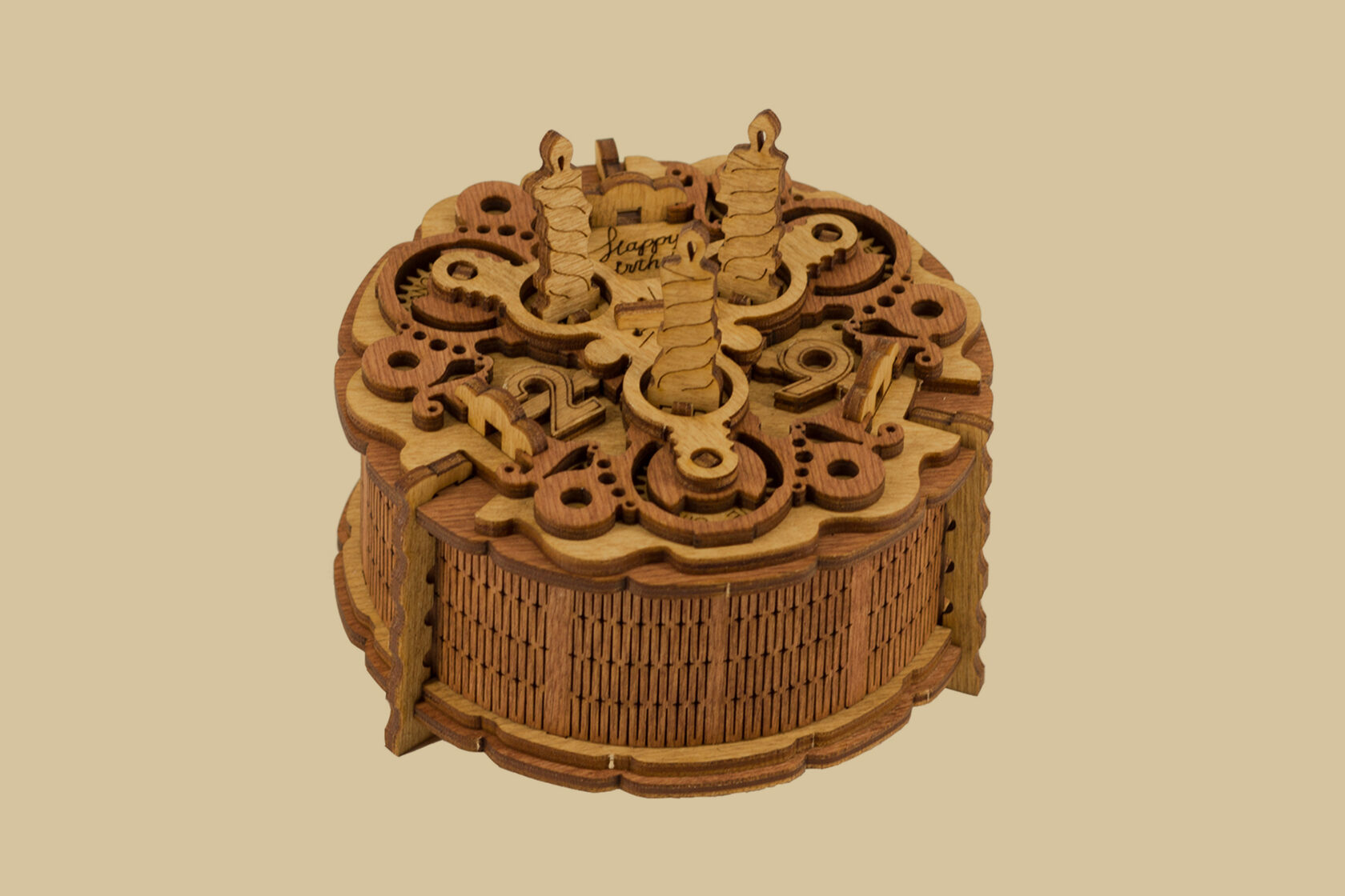 Шкатулка-головоломка «Торт именинника» ждет своего виновника торжества! Разгадайте ее механизмы и доберитесь до спрятанного внутри подарка.