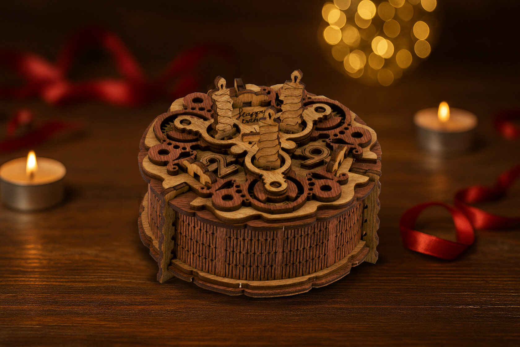 Мастер создал для дорогого именинника шкатулку в виде торта. Чтобы её открыть, нужно было разгадать хитрый механизм со свечами. Внутри ждал не просто предмет, а ценный подарок, ради которого всё и было задумано.